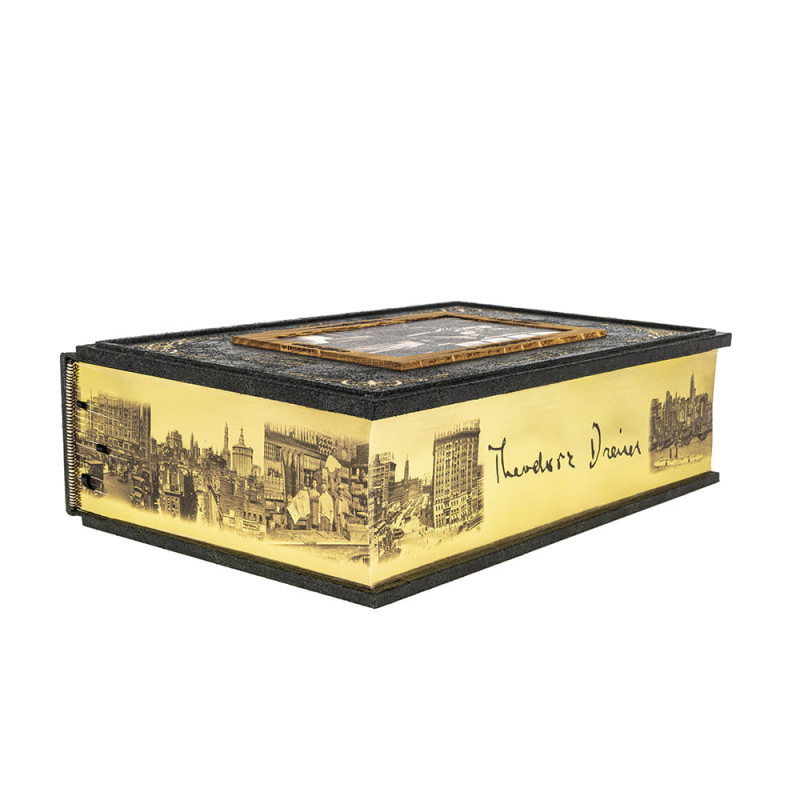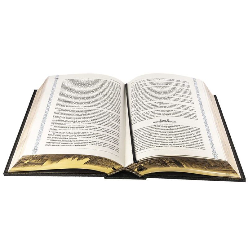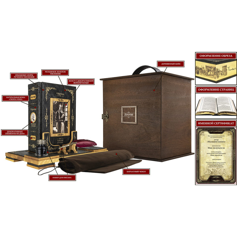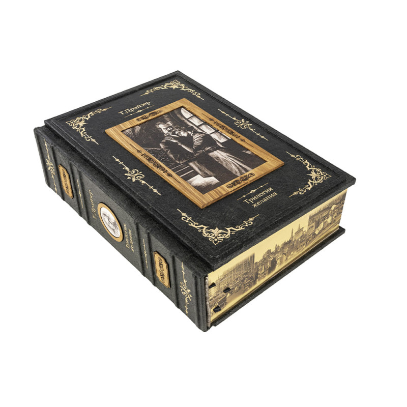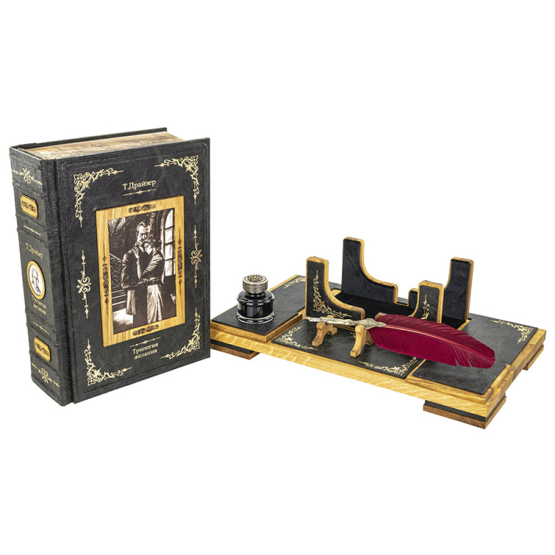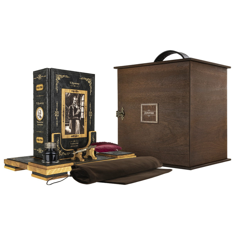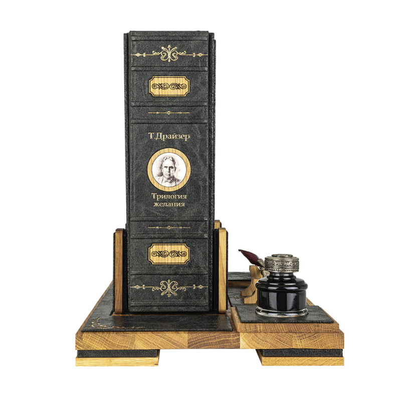 Составной переплет "Брадель" ручной работы, выполнен из натуральной кожи "Crosta Nero" производства итальянской кожевенной фабрики "Carisma". Обложка книги оформлена рельефным золотым тиснением, c использованием фольги "Luxor 240", декорирована вставкой из холста с художественной фотопечатью и накладками из натурального дуба. Обрез книги выполнен в уникальной технике позолоты с нанесением художественной репродукции. Подставка выполнена в том же стиле что и книга, а также декорирована перьевой ручкой и чернильницей.