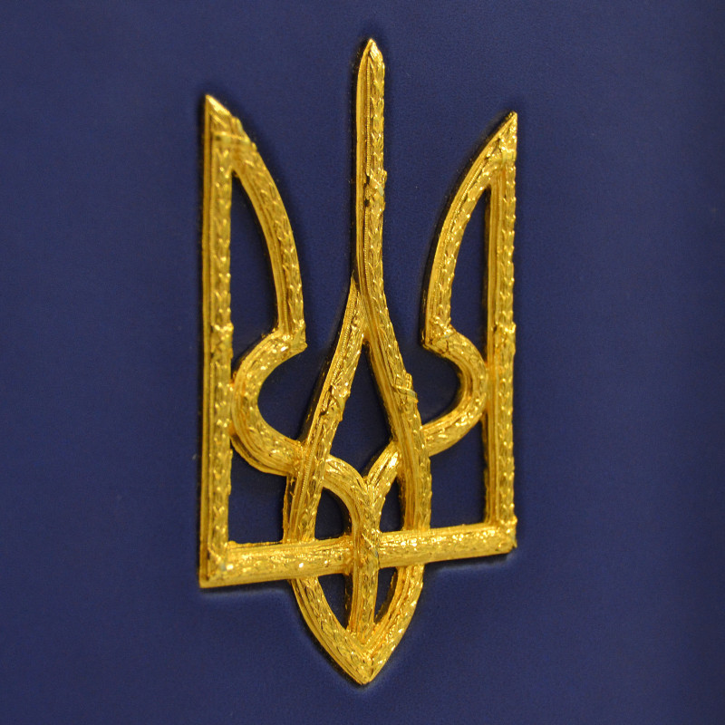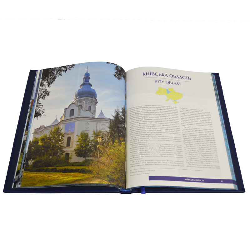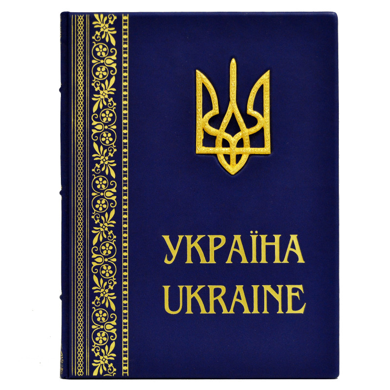The book "Україна. Ukraine" is an unforgettable edition created by a producer from Ukraine. The cover of the book is made of genuine leather in an exquisite blue color. It has a bilingual edition, which contains text in Ukrainian and English.
