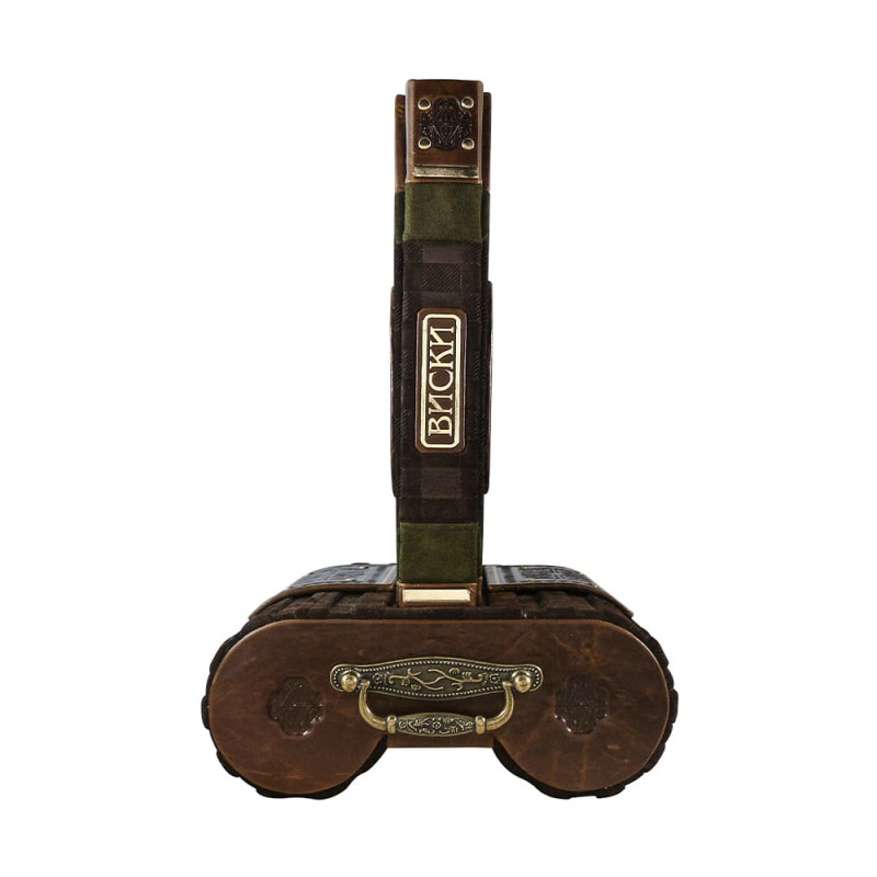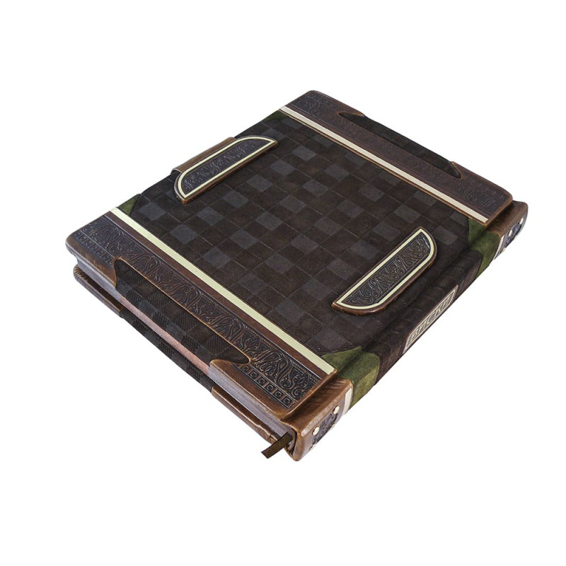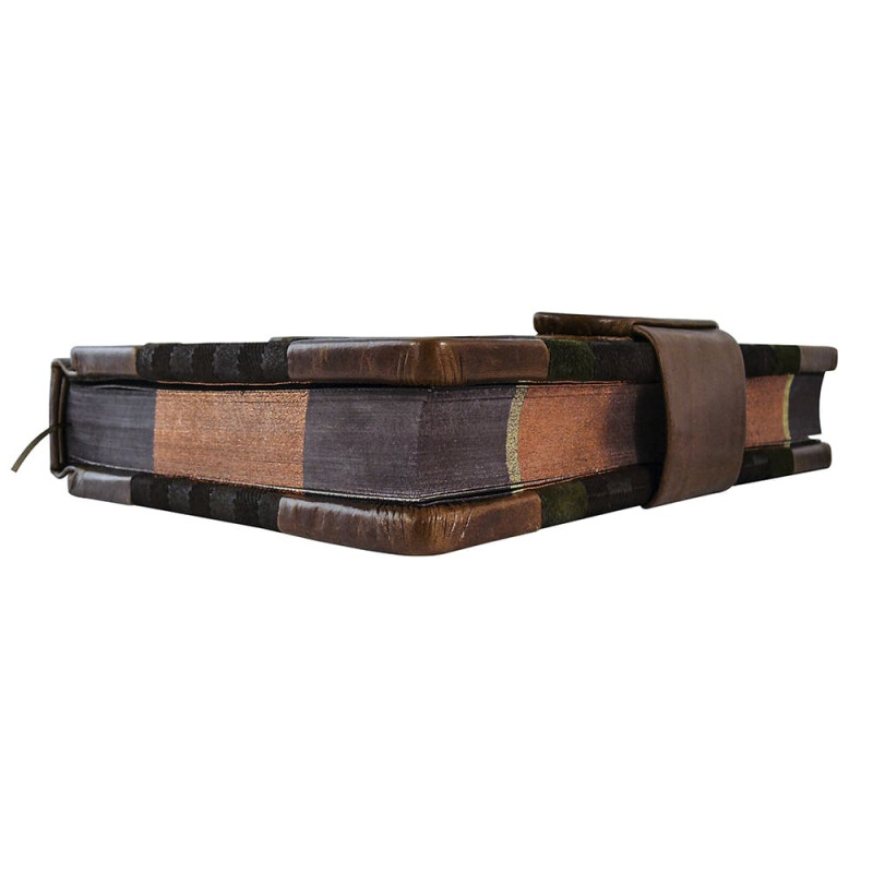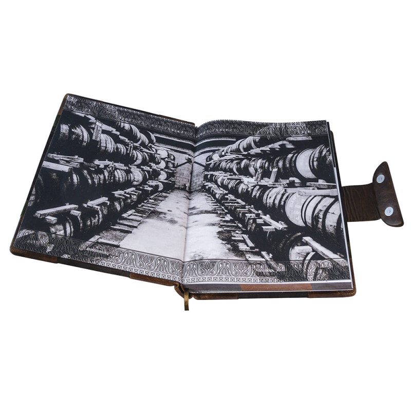 Составной переплет "Брадель" ручной работы, выполнен из комбинации натуральных кож "Robat Maronne", "Gabbia camoscio" и "Troppopieno luminoso" производства итальянской кожевенной фабрики "Benericetti". Обложка книги двухуровневая, декорирована комбинацией глубокого блинтового и рельефного золотого тиснения (использована фольга "Luxor 240"), оформлена позолоченными ножками (4 штуки) и латунными хольнитенами. Обрез блока вручную полирован, окрашен и позолочен сусальным червонным золотом. Подставка авторской конструкции "Бочка" декорирована под стиль книги и внутри устлана итальянским коттон-бархатом.