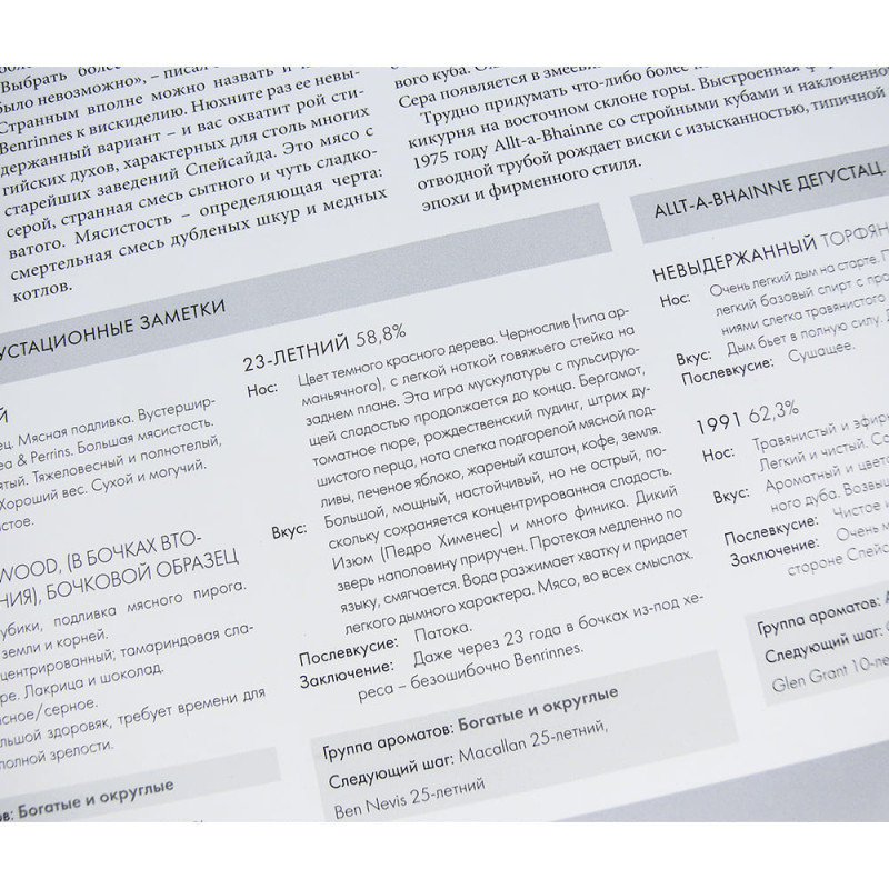 Есть в книге и сведения, которые в повседневной жизни пригодятся абсолютно всем ценителям крепких и благородных спиртных напитков. Это профессиональные дегустационные заметки по 350 образцам виски (включая бурбоны и ржаные виды), в которых напитки разных сортов, от разных производителей подробно разбираются автором по трем основным категориям: аромат, вкус, послевкусие. Заметки помогут любителям виски сориентироваться во множестве видов и купажей, выбрав для себя самые подходящие.