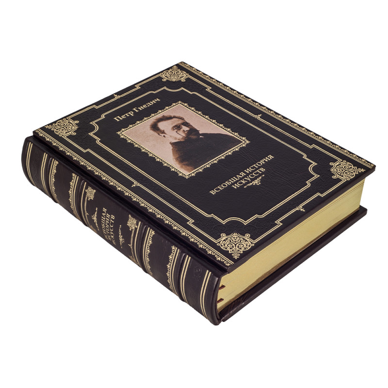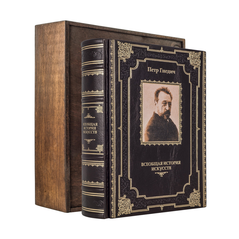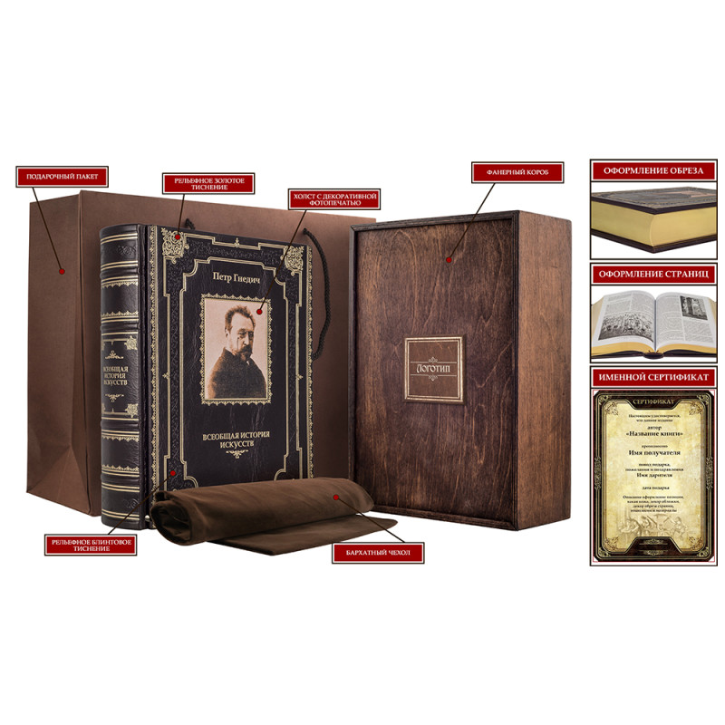 Составной переплет "Брадель", ручной работы, изготовлен из натуральной кожи "Perugia Brown" производства итальянской кожевенной фабрики "Carisma". Обложка книги оформлена комбинацией рельефного тиснения: глубокого блинтового и золотого, с использованием фольги "Luxor 240", а также декорирована вставкой из холста с художественной фотопечатью. Обрез книги выполнен в авторской технике позолоты с нанесением орнамента. Персональный сертификат с индивидуальным текстом поздравления. Бархатный мешочек. Деревянная коробка.