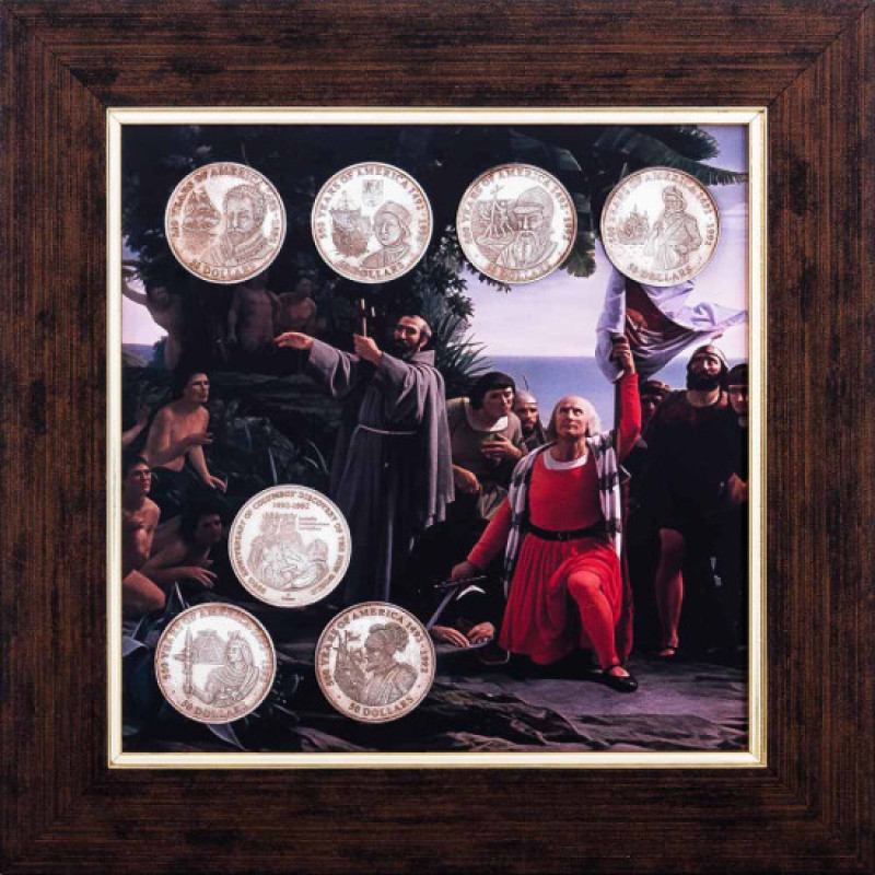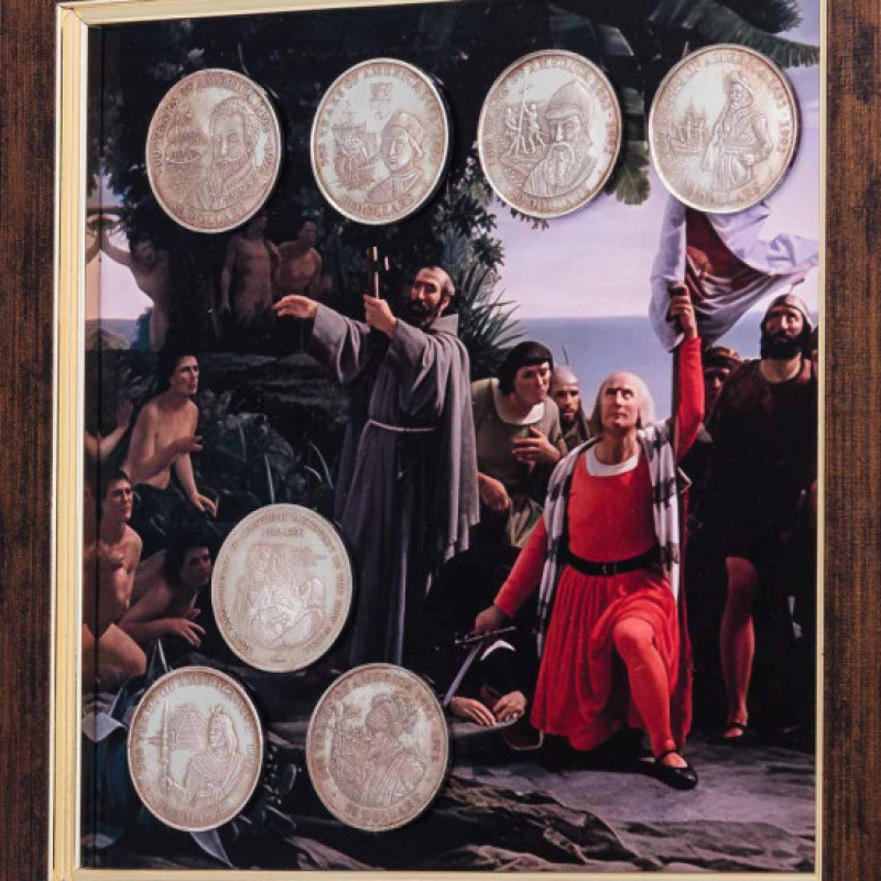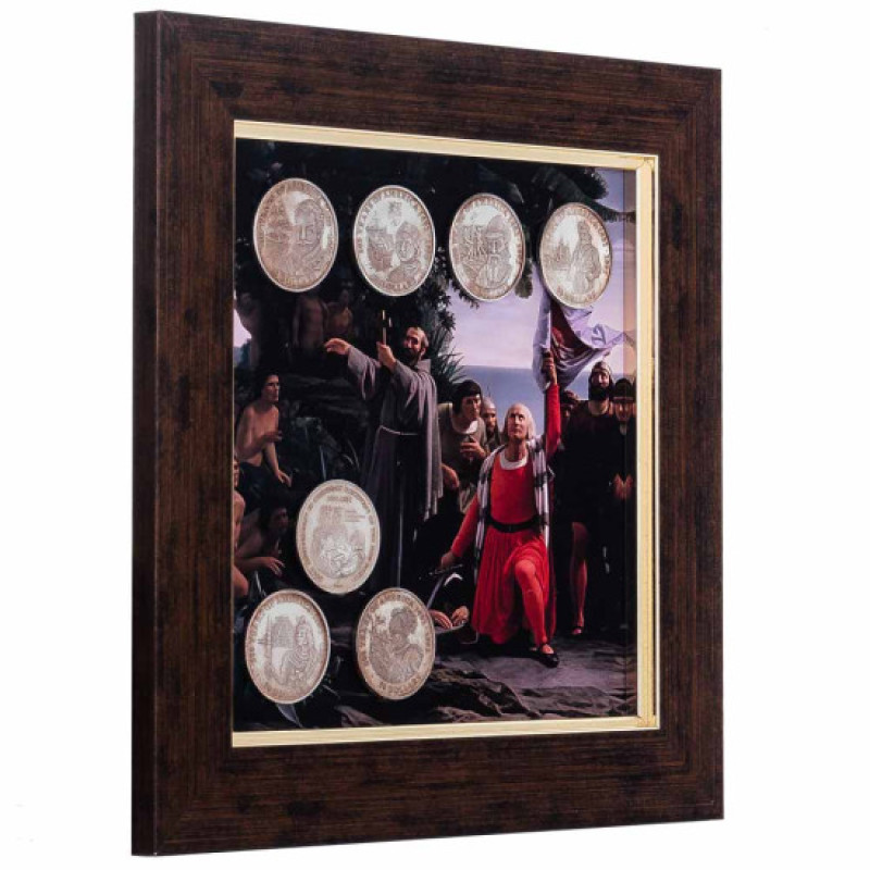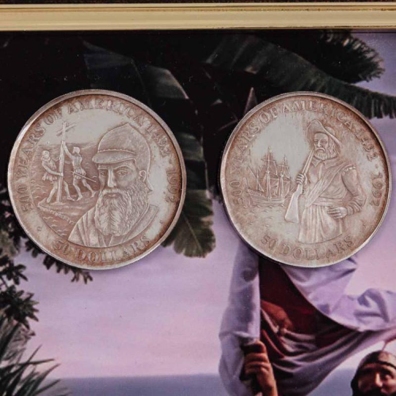 Коллаж "500 лет открытия Америки: 1492-1992 г." с монетами – уникальная настенная композиция, сочетающая историческую символику, художественное оформление и нумизматическую тематику в одном памятном сувенире.