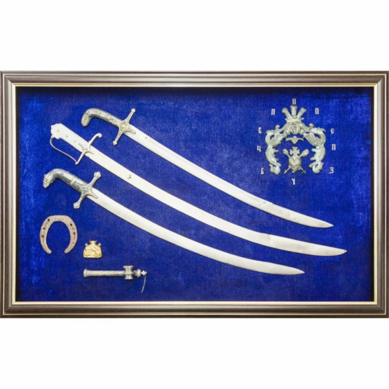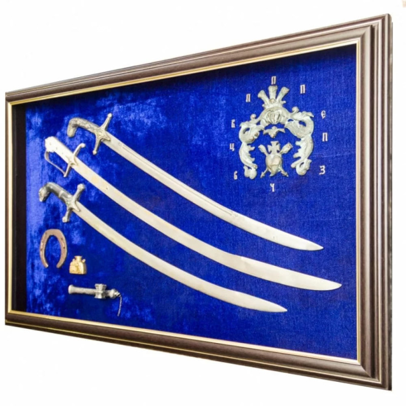 Коллаж оформлен в элегантную раму, задний фон выполнен из бархата насыщенного синего цвета. Сабли изготовлены из меди и украшены покрытием из серебра и позолоты. Такое сочетание придаёт изделиям благородный блеск и подчеркивает их художественную ценность.