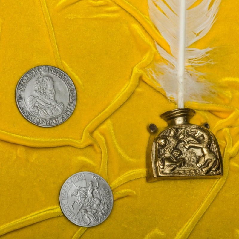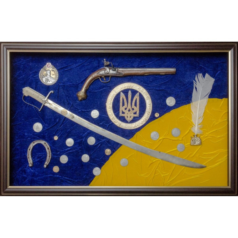 Коллаж состоит из накладок в виде сабли, револьвера, монет, подковы и трезубца Украины. Эти символы олицетворяют силу, мужество, верность и свободолюбие казачества. Накладки изготовлены из меди, покрыты серебром и позолотой, украшены эмалью. Мастерская работа и использование благородных материалов делают коллаж настоящим произведением искусства. Картина оформлена в красивый багет с бархатным фоном в цветах украинского флага. Такое оформление подчеркивает патриотическую направленность коллажа и делает его еще более привлекательным.