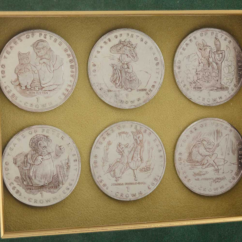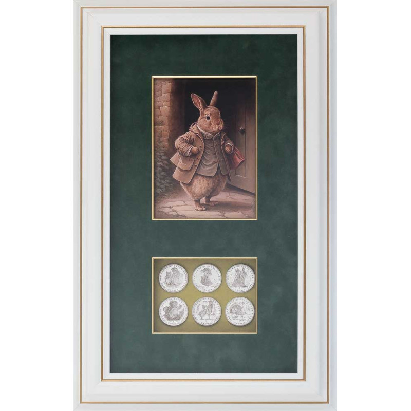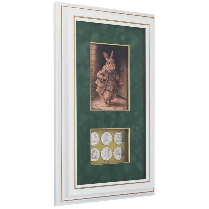 Нижняя часть композиции содержит шесть реплик коллекционных монет, выпущенных в 1993 году к 100-летию со дня рождения Питера Рэббита – знаменитого персонажа Беатрис Поттер. Каждая монета номиналом "1 CROWN" изображает одного из героев любимых детских историй, что делает этот коллаж не только декоративным, но и нумизматически ценным.