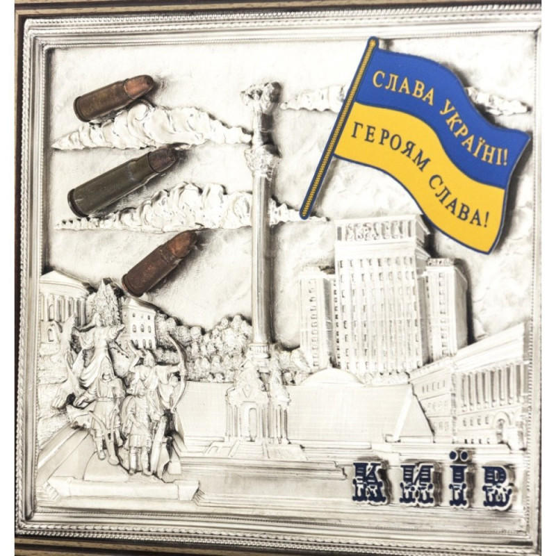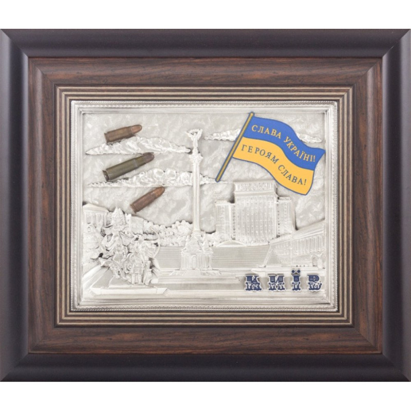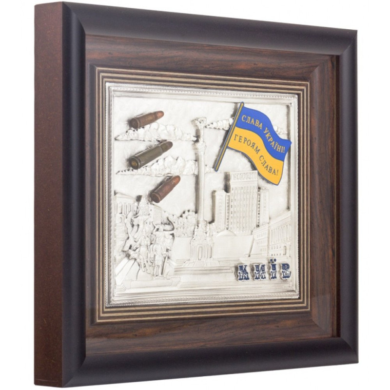 Данный подарочный сувенир оформлен в багет и защищен плотным стеклом. Сама накладка изготовлена из меди, сверху покрыта серебром. Декорирована художественной ювелирной эмалью и патиной.