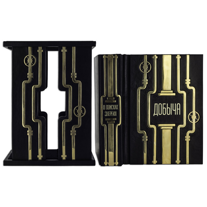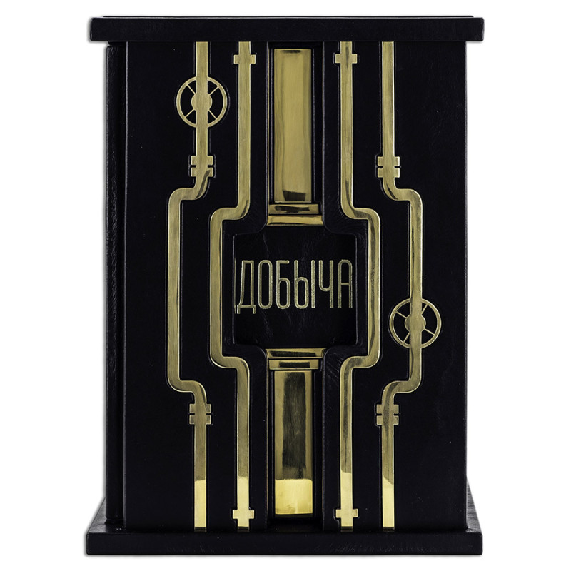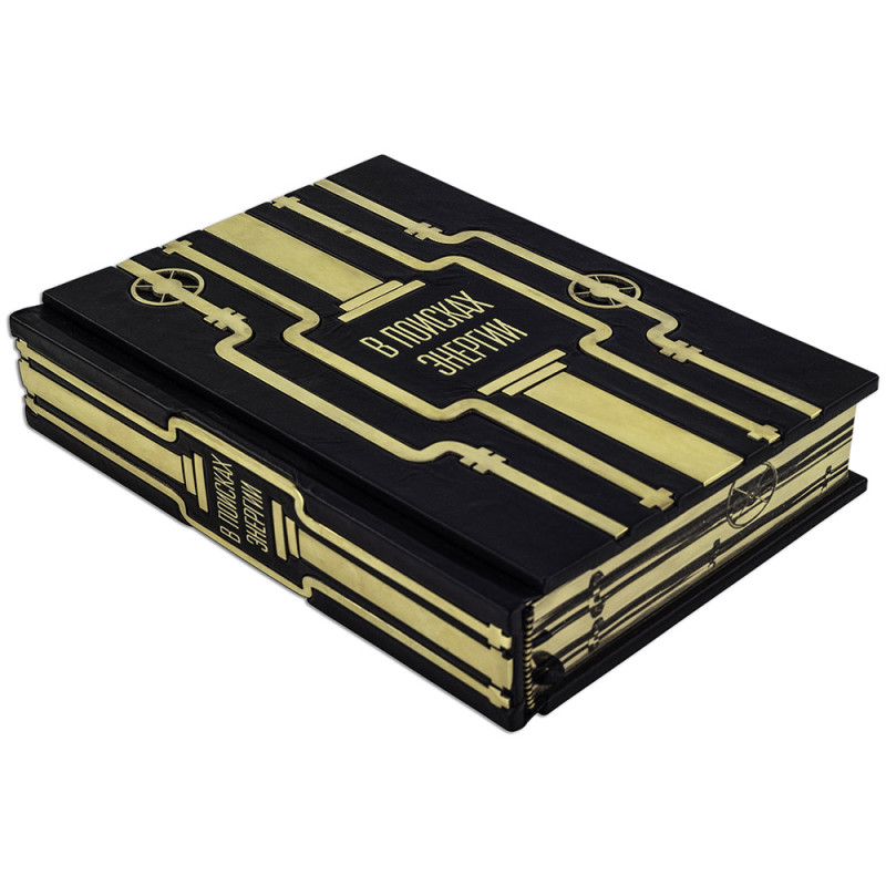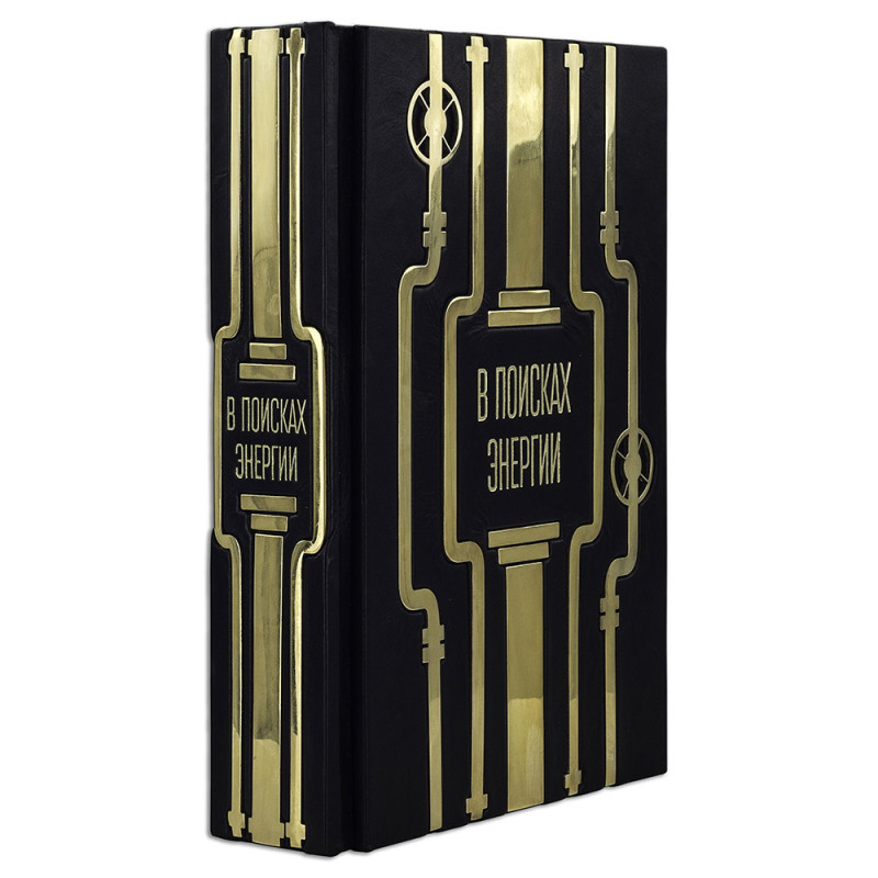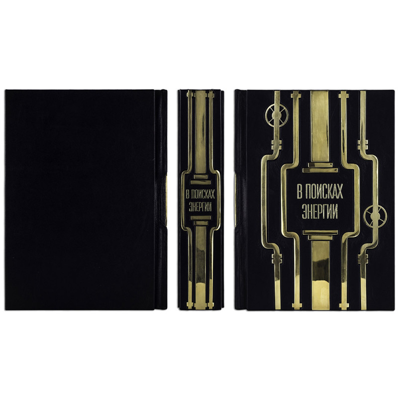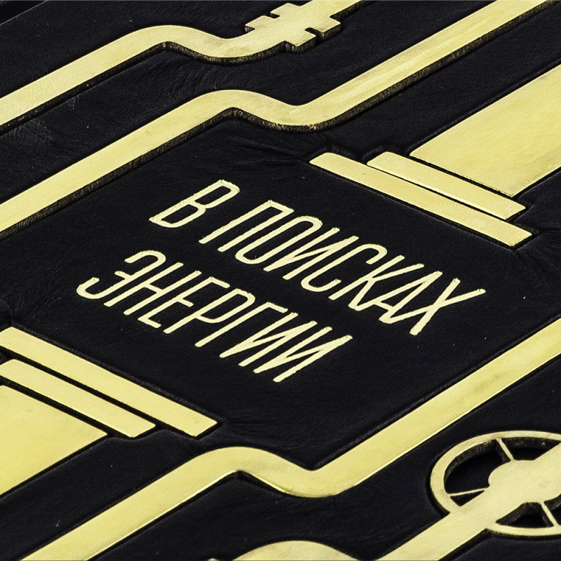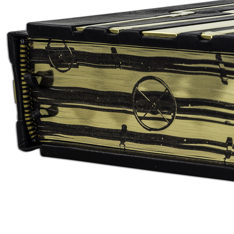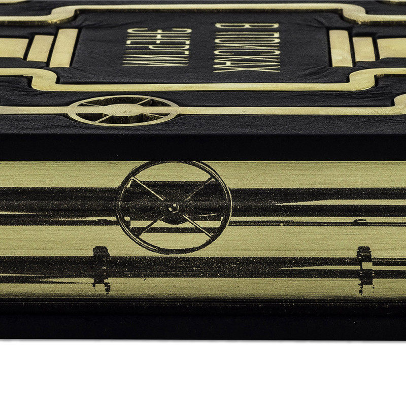 Составной переплет "Брадель", ручной работы, изготовлен из натуральной кожи "Robbat Nero" производства итальянской кожевенной фабрики "Carisma". Обложка книги двухуровневая, оформлена рельефным золотым тиснением (с использованием фольги "Luxor 240") и накладными декоративными латунными элементами. Обрез выполнен в уникальной технологии художественной запечатки золотой основы. Сертификат. Бархатный чехол.