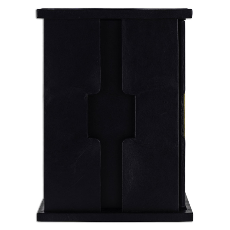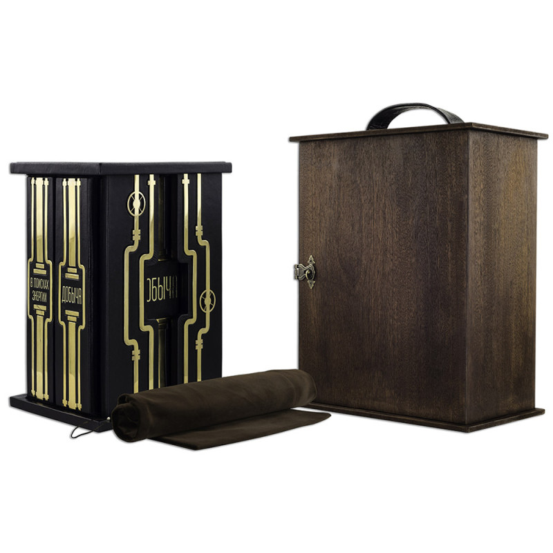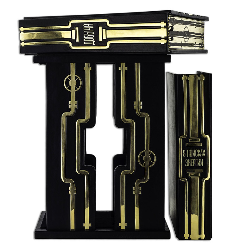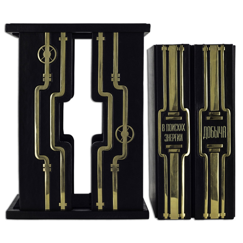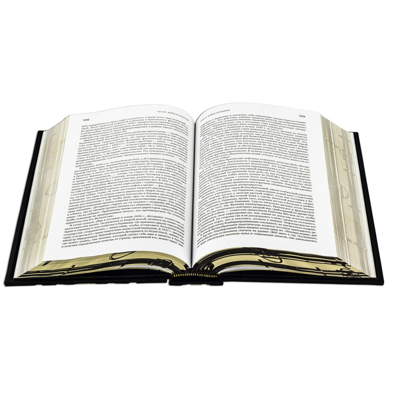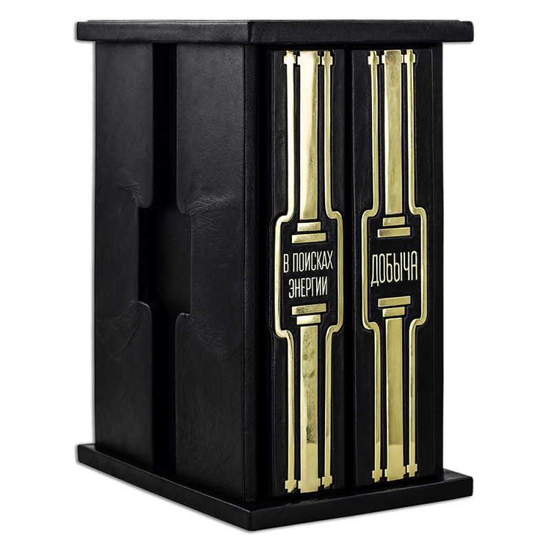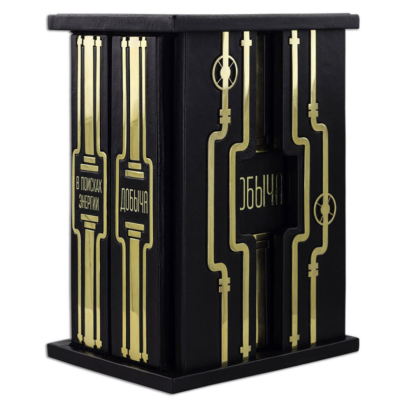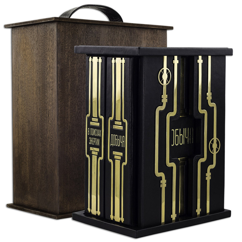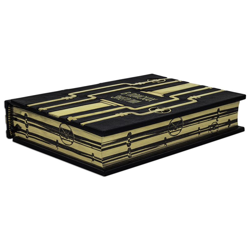 Составной переплет "Брадель", ручной работы, изготовлен из натуральной кожи "Robbat Nero" производства итальянской кожевенной фабрики "Carisma". Обложка книги двухуровневая, оформлена рельефным золотым тиснением (с использованием фольги "Luxor 240") и накладными декоративными латунными элементами. Обрез выполнен в уникальной технологии художественной запечатки золотой основы. Сертификат. Бархатный чехол.