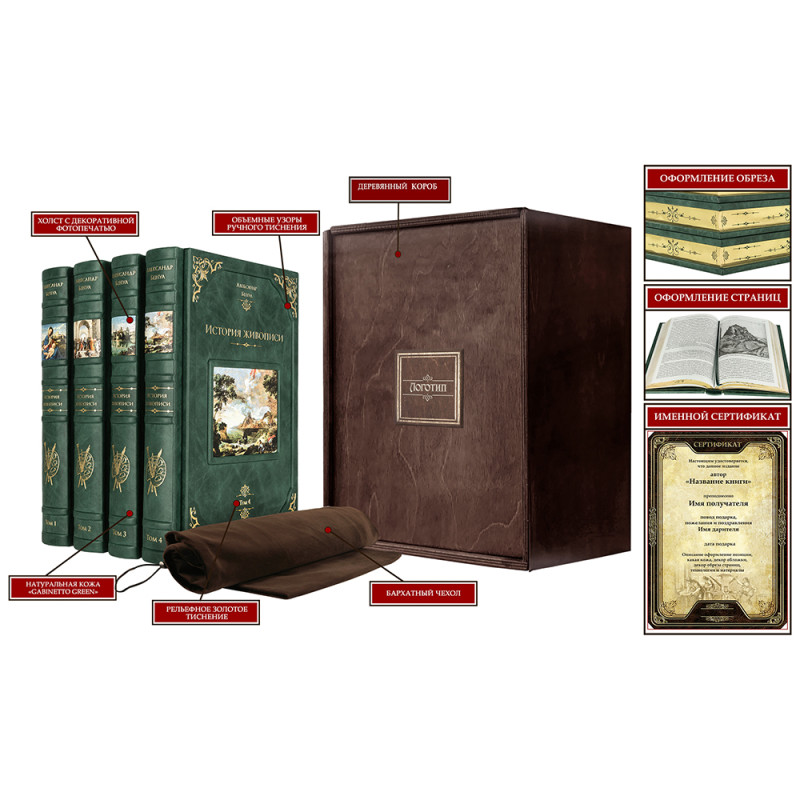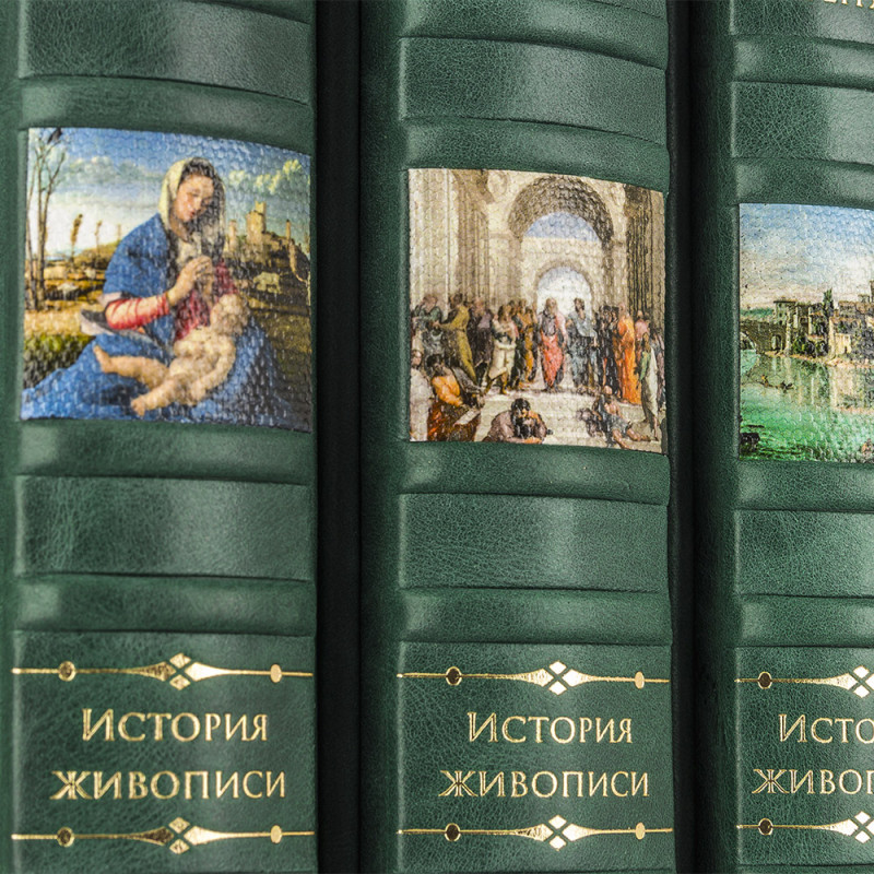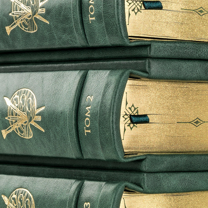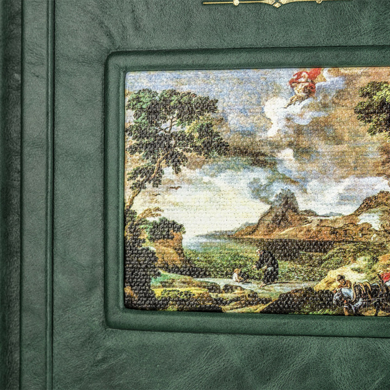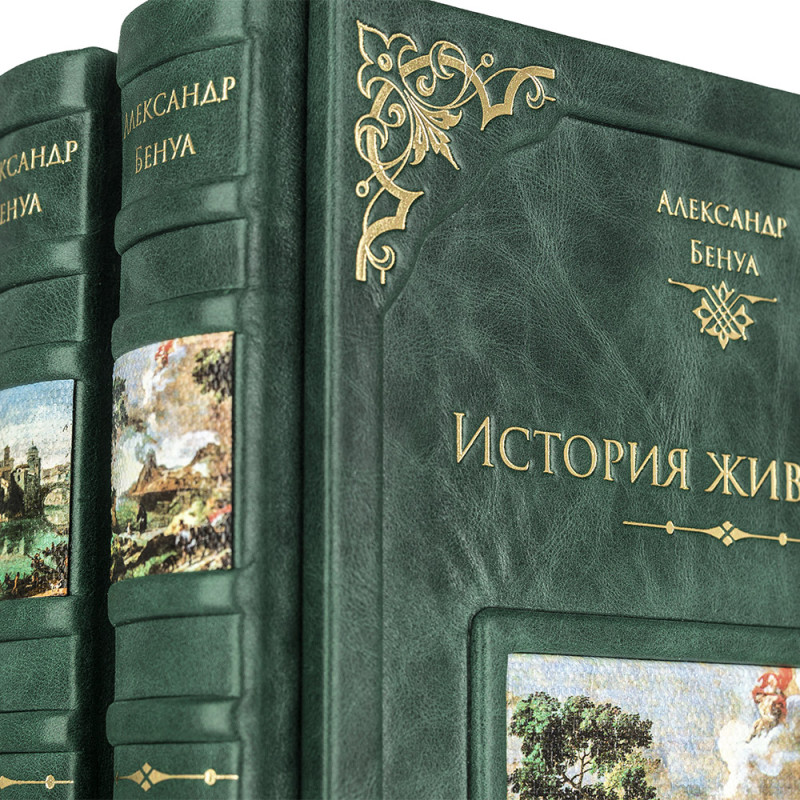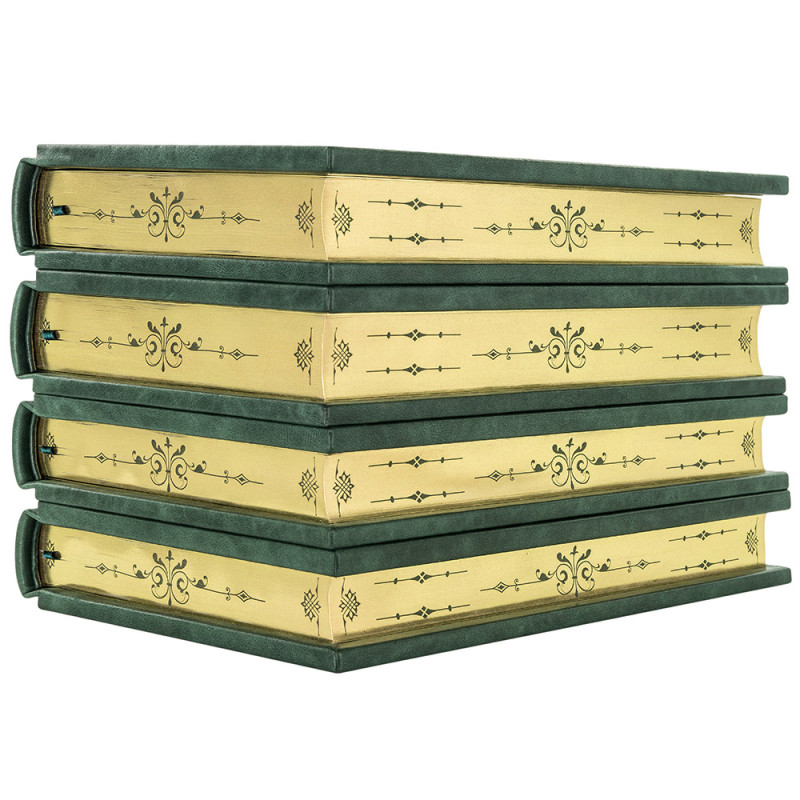Составной переплет "Брадель", ручной работы, изготовлен из натуральной кожи "Gabinetto Green" производства итальянской кожевенной фабрики "Carisma". Обложки книг двухуровневые, оформлены вставками из холста с художественными репродукциями и рельефным золотым тиснением, с использованием фольги "Luxor 240". Обрезы книжных блоков выполнены в авторской технике золочения с нанесением орнамента. Персональный сертификат с индивидуальным текстом поздравления. Бархатный мешочек. Деревянная коробка.