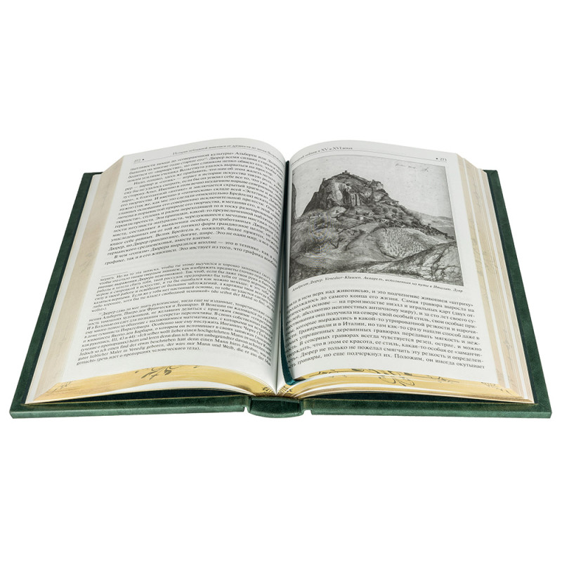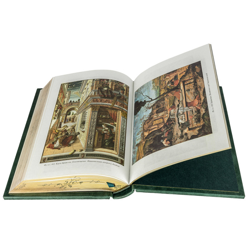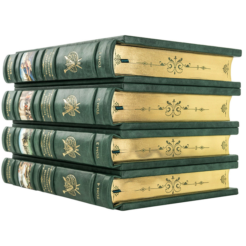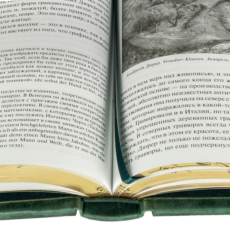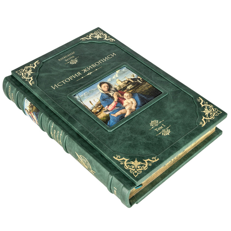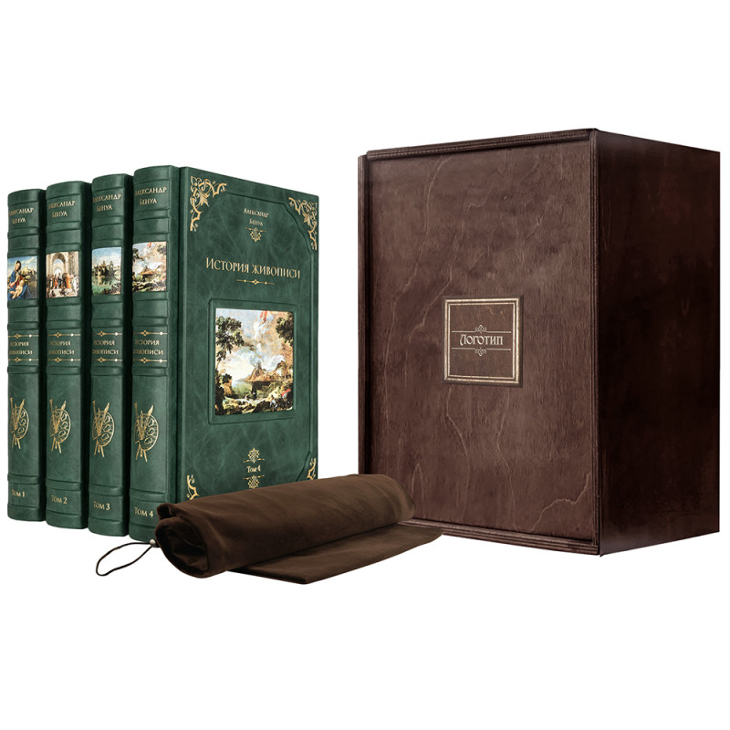 Составной переплет "Брадель", ручной работы, изготовлен из натуральной кожи "Gabinetto Green" производства итальянской кожевенной фабрики "Carisma". Обложки книг двухуровневые, оформлены вставками из холста с художественными репродукциями и рельефным золотым тиснением, с использованием фольги "Luxor 240". Обрезы книжных блоков выполнены в авторской технике золочения с нанесением орнамента. Персональный сертификат с индивидуальным текстом поздравления. Бархатный мешочек. Деревянная коробка.