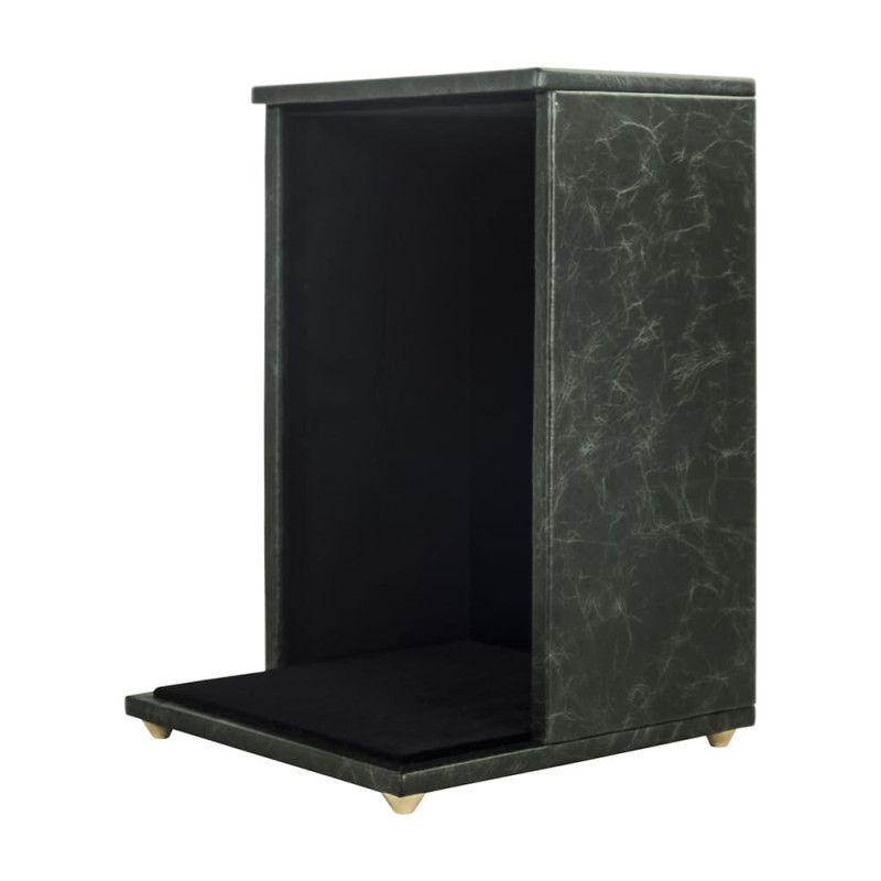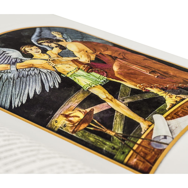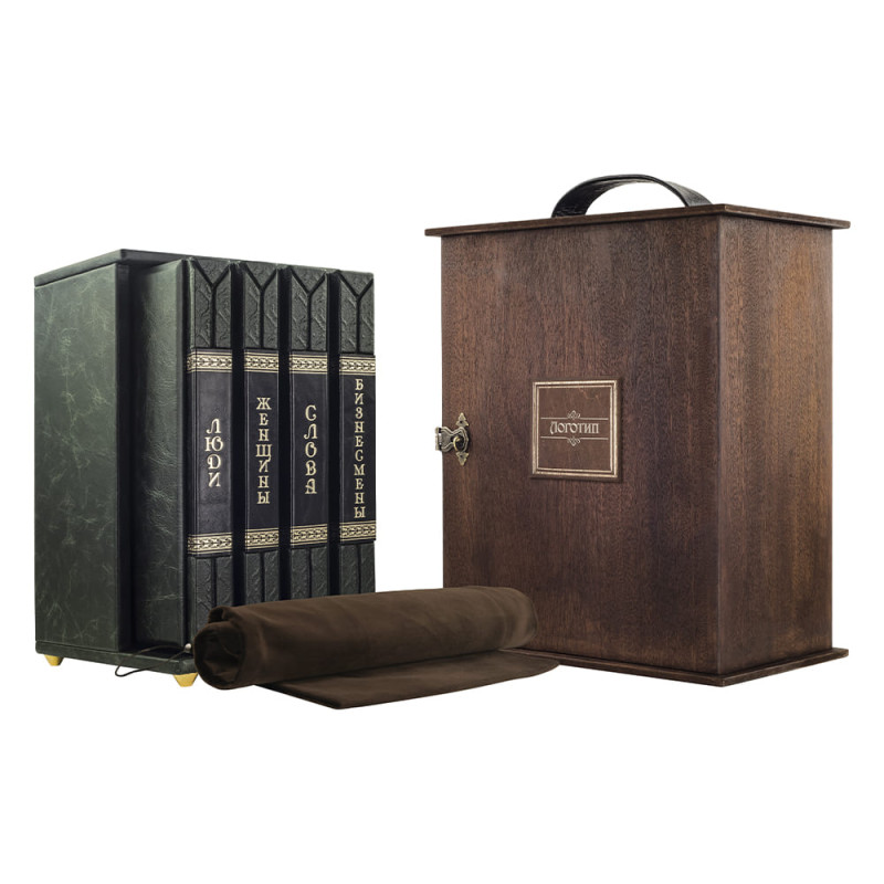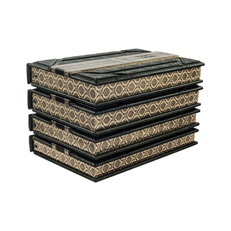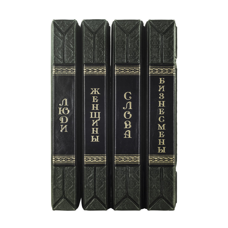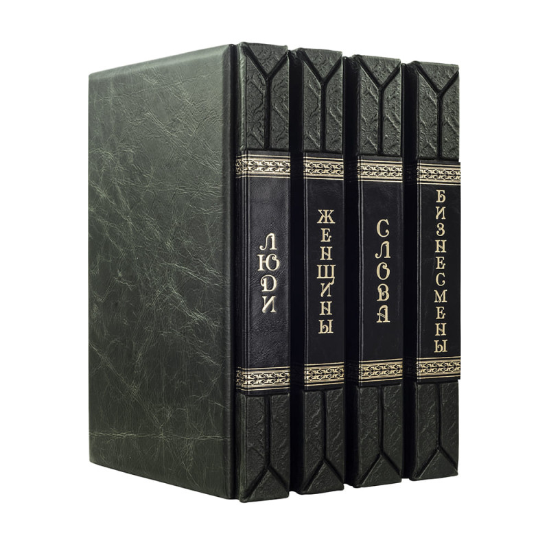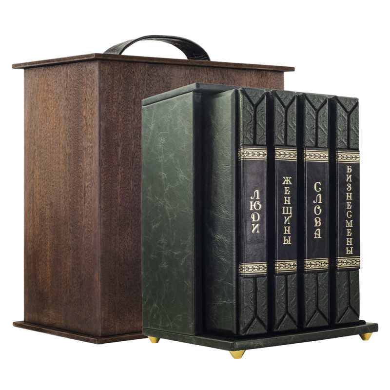 Составной переплет "Брадель" ручной работы. Комбинация натуральных кож "Smeraldo scuro" и "Nero" производства кожевенной итальянской фабрики "Claudio". Обложки книг декорированы глубоким блинтовым и рельефным золотым тиснением. Обрезы книжных блоков оформлены в авторской технике золочения с нанесением орнамента. Футляр на латунных ножках выполнен в едином стиле с книгами и устлан французским коттон-бархатом.