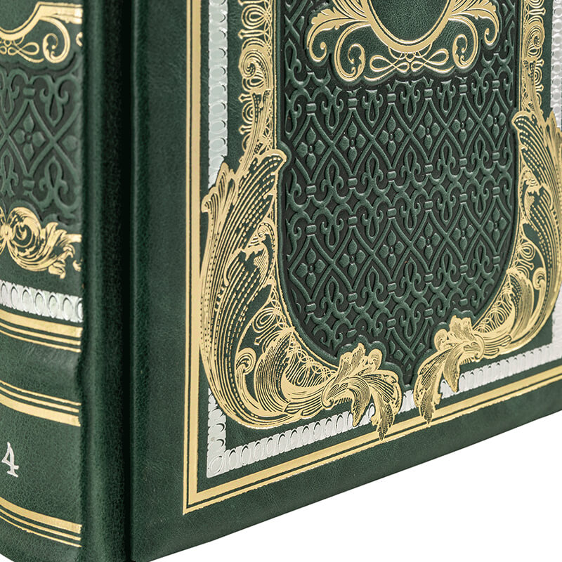 Составной переплет «Брадель» ручной работы, выполнен из натуральной кожи «Robbat Verde» производства итальянской кожевенной фабрики Carisma». Обложка книг оформлена комбинацией многоуровневого объемного тиснения: рельефного золотого и серебряного, c использованием фольги «Luxor 240» и глубокого блинтового. Обрезы книг выполнены в авторской технике позолоты с нанесением орнамента.
