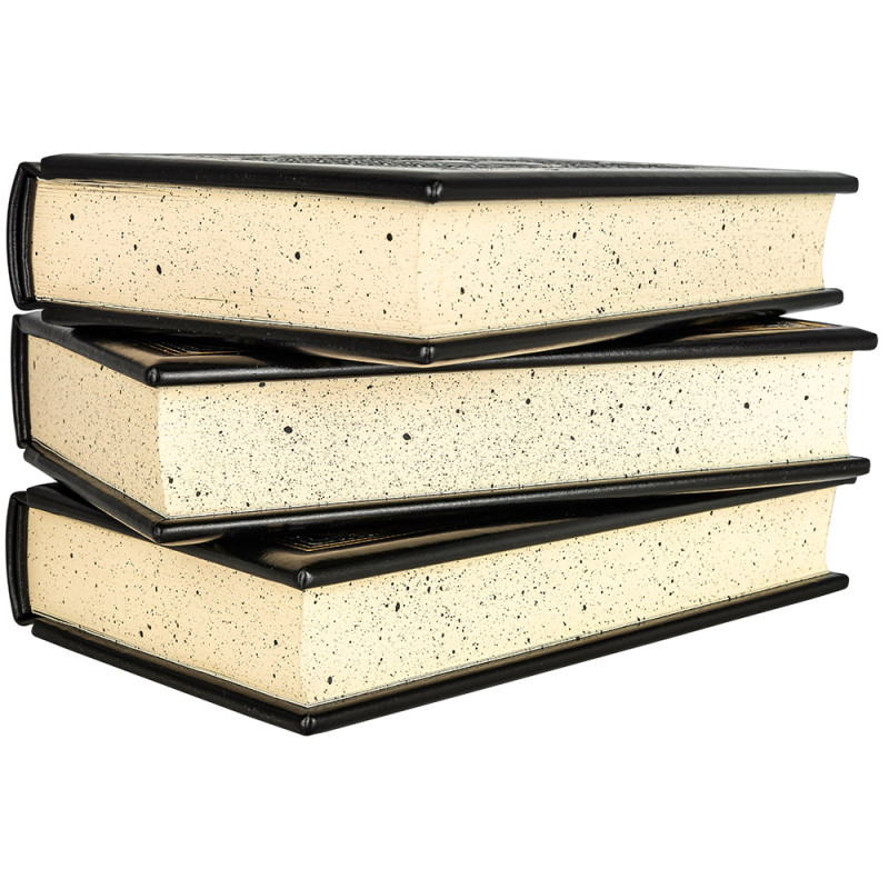 Составной переплет "Брадель" ручной работы, выполнен из натуральной кожи "Robbat Nero" производства итальянской кожевенной фабрики "Carisma". Обложка книг оформлена комбинацией многоуровневого объемного тиснения: рельефного золотого и серебряного, c использованием фольги "Luxor 240" и глубокого блинтового. Обрезы книг выполнены в авторской технике позолоты с нанесением орнамента. Бархатный мешочек. Деревянный кейс.