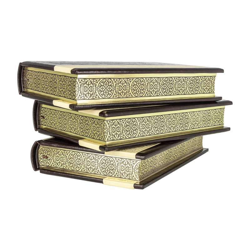 Составной переплет "Брадель" ручной работы. Комбинация натуральных кож "Robbat Cognac" и "Robbat Wisky" производства итальянской кожевенной фабрики "Claudio". Обложки книг и футляр оформлены многоуровневым тиснением: рельефным золотым и серебряным (фольги "Luxor 240"). Корешок кругленый с натуральными бинтами. Кожаный каптал и шелковые ленты-ляссе. Обрезы книг выполнены в авторской технике золочения с нанесением орнамента. Футляр устлан итальянским коттон-бархатом.