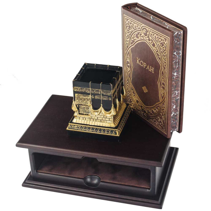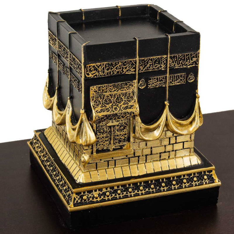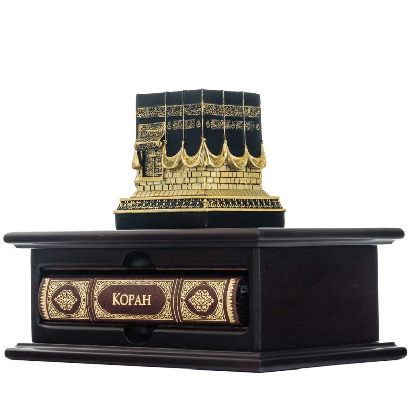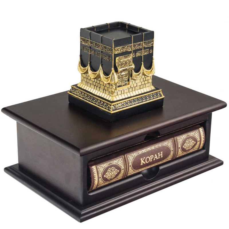 На крышке размещена объёмная 3D композиция с изображением Мекки и Каабы, выполненная из смолы с эффектом позолоты. Высокая детализация рельефа передаёт величественность и духовную ценность священного места.