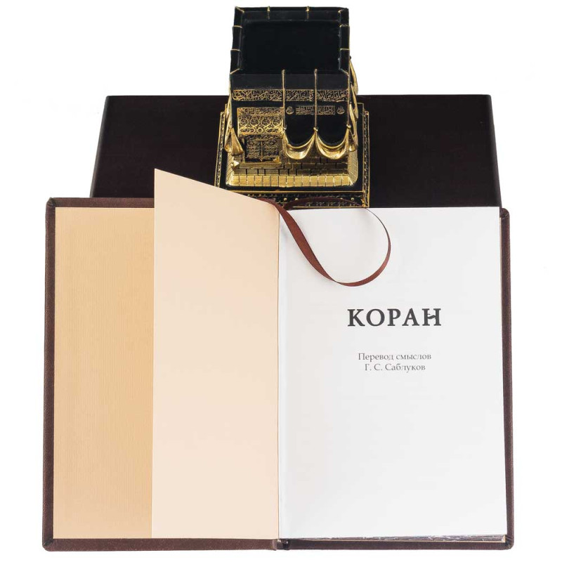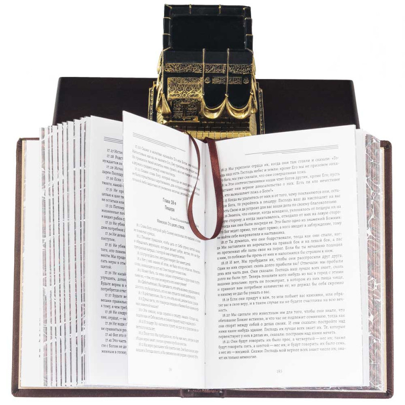 Внутри находится главное — Священный Коран в премиальном исполнении. Переплёт выполнен из искусственной кожи, оформлен богатым золотым и блинтовым тиснением. Арабески и каллиграфия підчеркивают сакральную значимость книги.