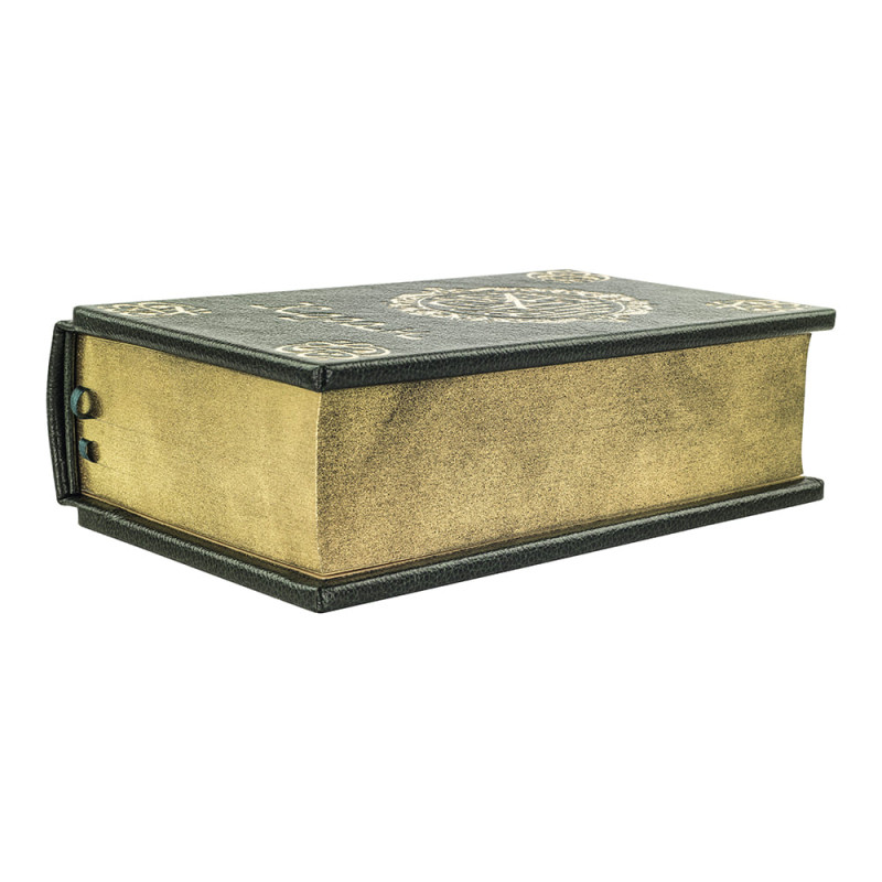 Составной переплет "Брадель", ручной работы, выполнен из натуральной кожи "Marma Smeraldo" производства итальянской кожевенной фабрики "Claudio". Обложка книги оформлена рельефным золотым тиснением, с использованием фольги "Luxor 240". Обрез книги оформлен в уникальной технике "Old Gold".
