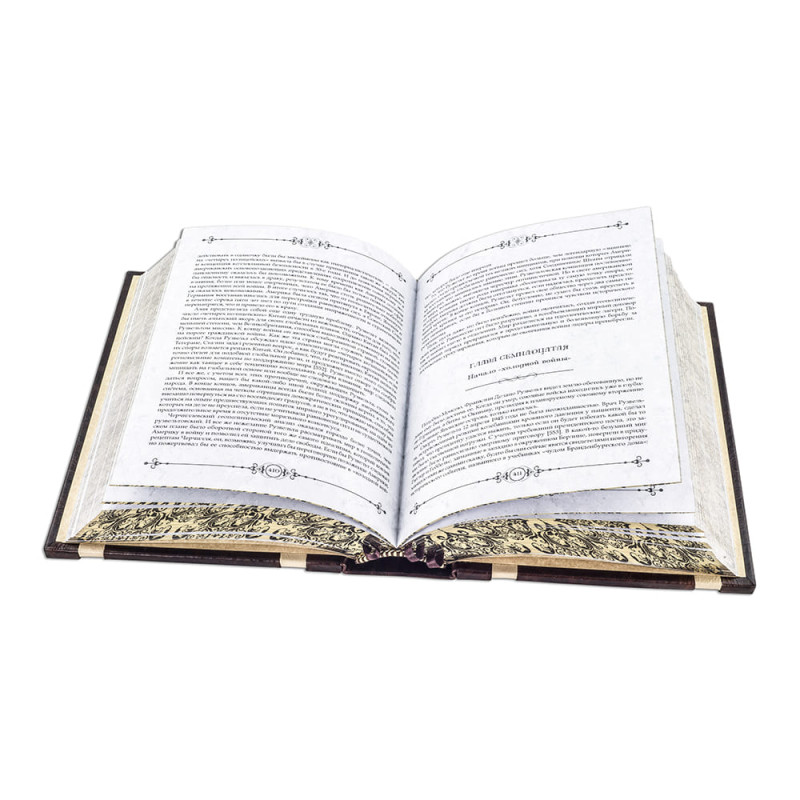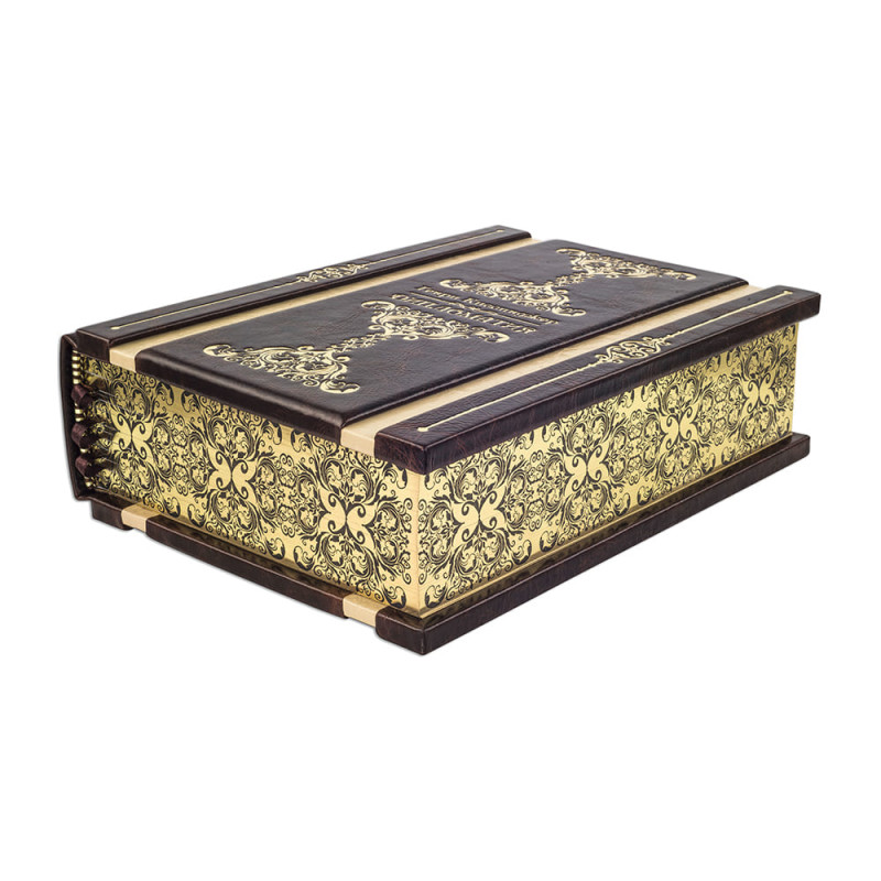 Составной переплет "Брадель", ручной работы, выполнен из комбинации натуральных кож (кожа "Сrepa luce", кожа "Bordeaux scuro" производства итальянской кожевенной фабрики "Carisma"). Обложка книги уникальной архитектуры, двухуровневая, оформлена золотым тиснением, с использованием фольги "Luxor 240". Обрез книги выполнен в уникальной технологии художественной запечатки золотой основы.