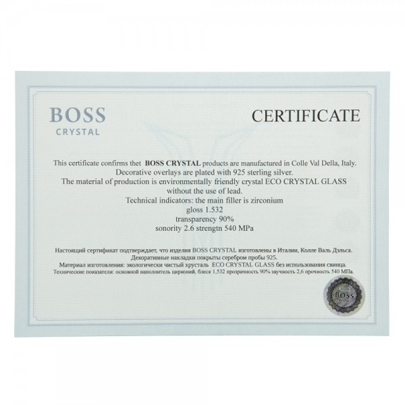 Каждый бокал в наборе выполнен вручную опытными мастерами Boss Crystal. Хрусталь высочайшего качества обладает искрящейся прозрачностью и звонким, мелодичным звоном, что позволяет в полной мере насладиться вкусом и ароматом вашего любимого виски.