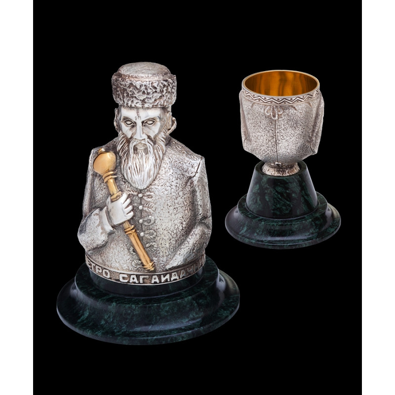 Набор чарок "ГЕТЬМАНИ" серии НАЦИОНАЛЬНА - это изысканный набор, созданный с использованием высококачественных материалов. Каждый предмет изготовлен из бронзы, которая изящно серебрится и позолочивается, придавая ему элегантный и роскошный вид.