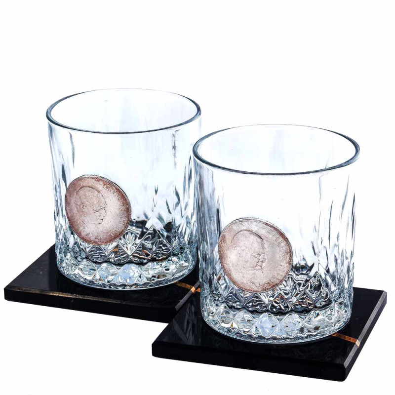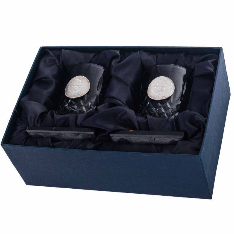 В набор входят два хрустальных бокала классической формы объемом 300 мл. Главная особенность – металлическая реплика монеты серебристого цвета с профилем Уинстона Черчилля, вмонтированная в каждый бокал. Этот акцент придает им исторический вес и статус эксклюзивного подарка.
