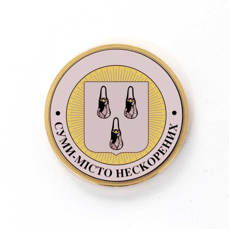 Монета имеет изысканный золотистый ободок, придающий ей премиальный и статусный внешний вид. В центре изображён герб города Сумы — три перевёрнутые сумы-торбы, согласно исторической символике. Герб размещён в круге на фоне золотистых солнечных лучей. По кругу нанесена надпись: «СУМЫ — ГОРОД НЕПОКОРЁННЫХ».