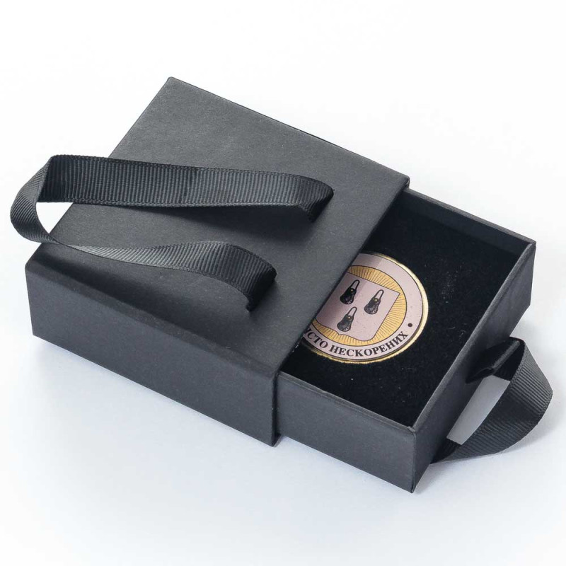 Монета упакована в чёрный подарочный футляр, обеспечивающий презентабельность и удобство хранения. Футляр часто дополнен лентой-ручкой, подчёркивающей торжественность подарка.