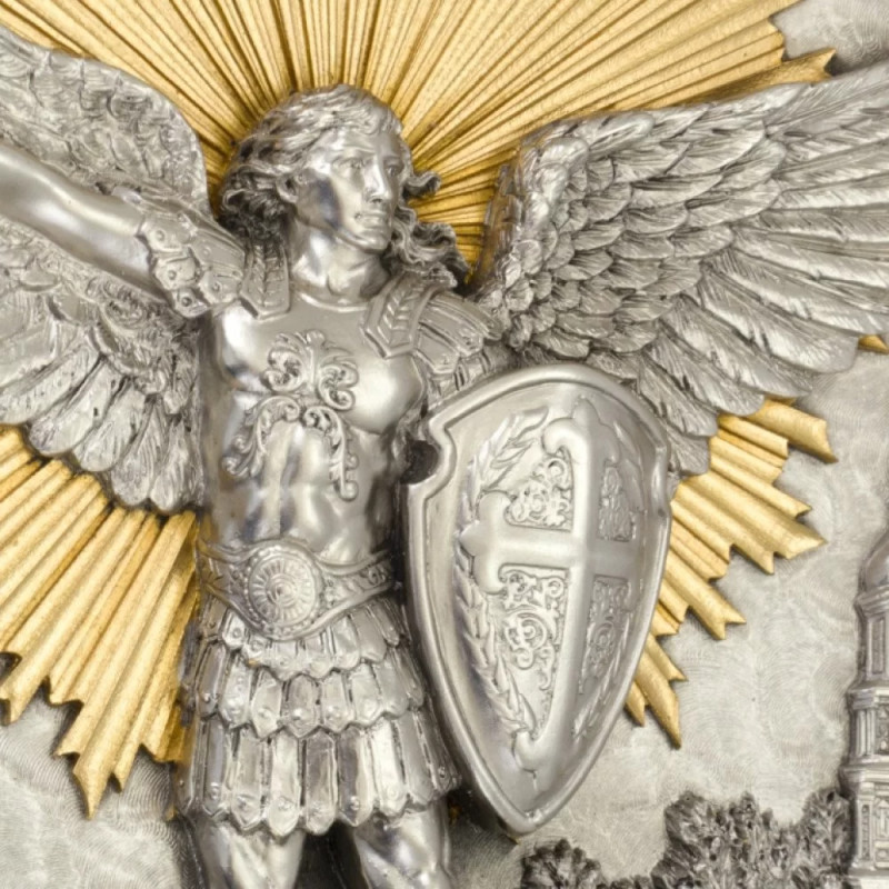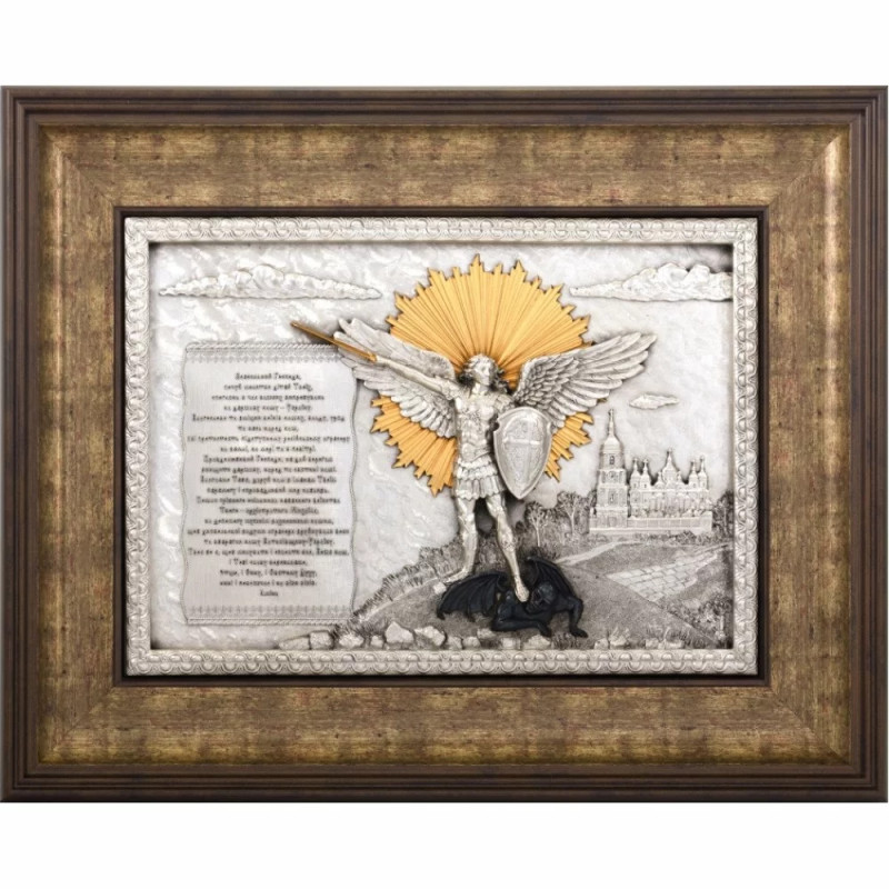 Серебряный величественный образ Архангела Михаила, окруженный лучами золотого света, побеждает черную фигуру дьявола. Это величественное событие возвышается над городом. На серебристом фоне расположена молитва. Парадная и торжественная аура усиливается серебристой одеждой. Пустяк ювелирной работы выделяется с помощью невероятного сплетения серебряного орнамента.