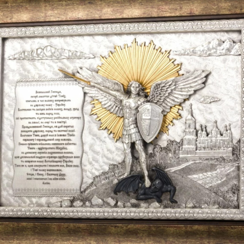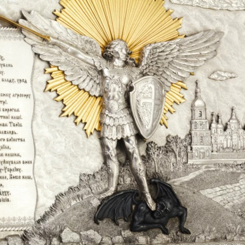 Этот значимый подарок посвящен Архангелу Михаилу, Верховному Вождю Небесных Войск. Архангел Михаил считается покровителем Киева, который, в свою очередь, является душой Украины. Его божественное могущество действительно очень велико, и он становится поддержкой в сложных жизненных моментах. Святой образ Архангела с молитвой об Украине установлен на фоне киевских холмов, рядом с Киево-Печерской Лаврой.