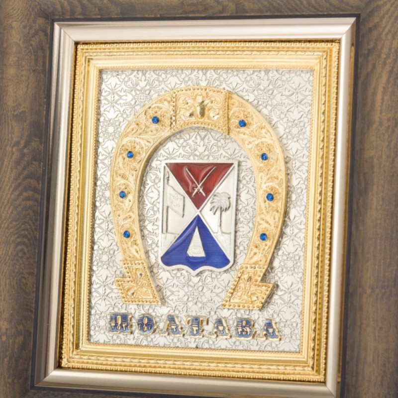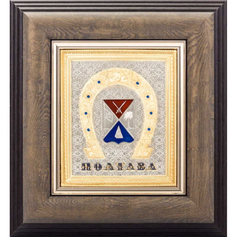 Основу подарочной композиции составляют: подкова - символ счастья и благополучия; и герб города Полтава в XVІІІ столетии. Вверху на красном фоне изображенные две скрещенные шпаги. С левой стороны на щите герба флаг. Правая часть содержала зеленую пальму - символ победы русских войск в битве при Полтаве 1709 года. В нижнем поле голубого цвета золотая пирамида с символом вечности - золотой змеей, скрученной в кольцо. В пасти змея держала свой хвост. По замыслу геральдистов, это должно было символизировать вечную славу воинов, которые погибли в бою.