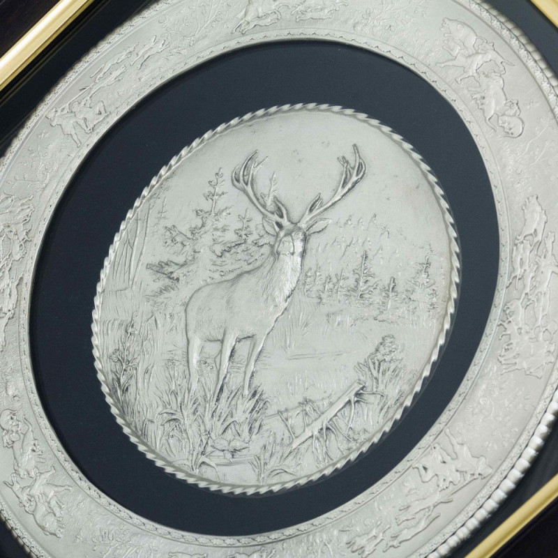 Олень, украшающий центр панно, является символом благородства, силы и чистоты. Сцены охоты, искусно выгравированные по периметру, придают панно динамизм и азарт. Фон из бархата добавляет панно роскоши и утонченности, а багет под стеклом бережно хранит его красоту.