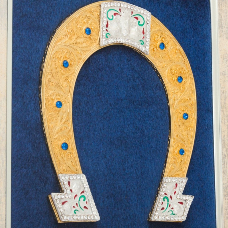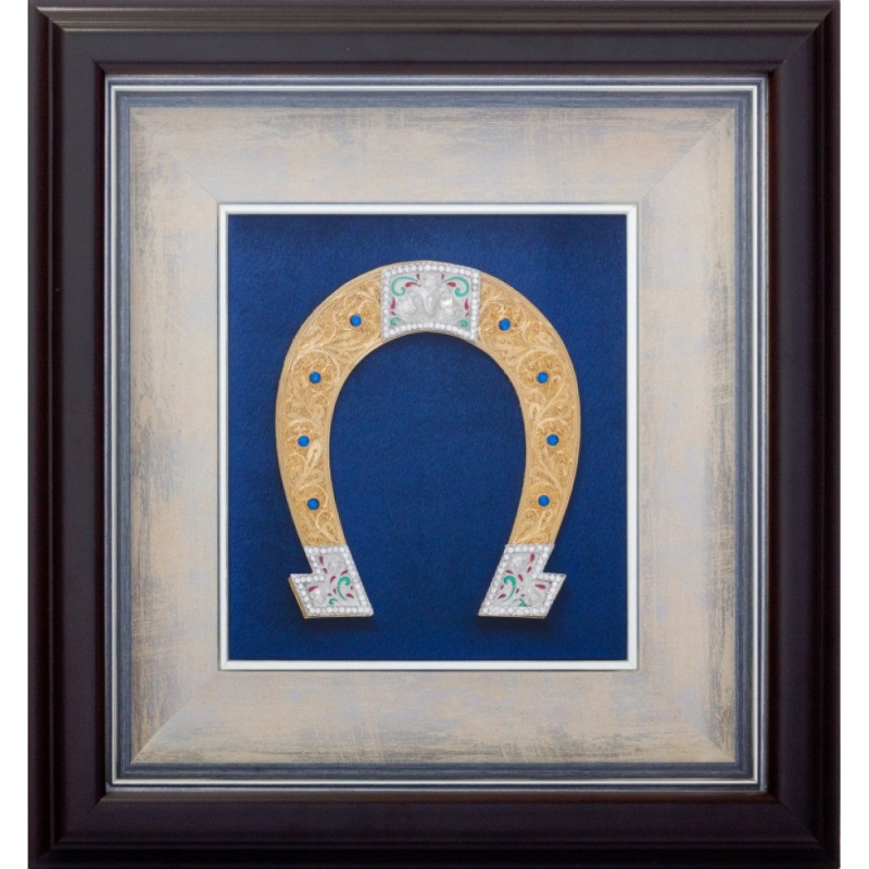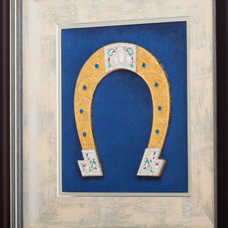 Ищете оригинальный и ценный подарок для близкого человека? Обратите внимание на подарочное панно "Подкова", которое станет настоящим украшением любого интерьера и символом удачи. Подкова изготовлена из меди и покрыта серебром и позолотой. Украшена эмалью и камнями. Оформлена в багет под стеклом на бархатном фоне.