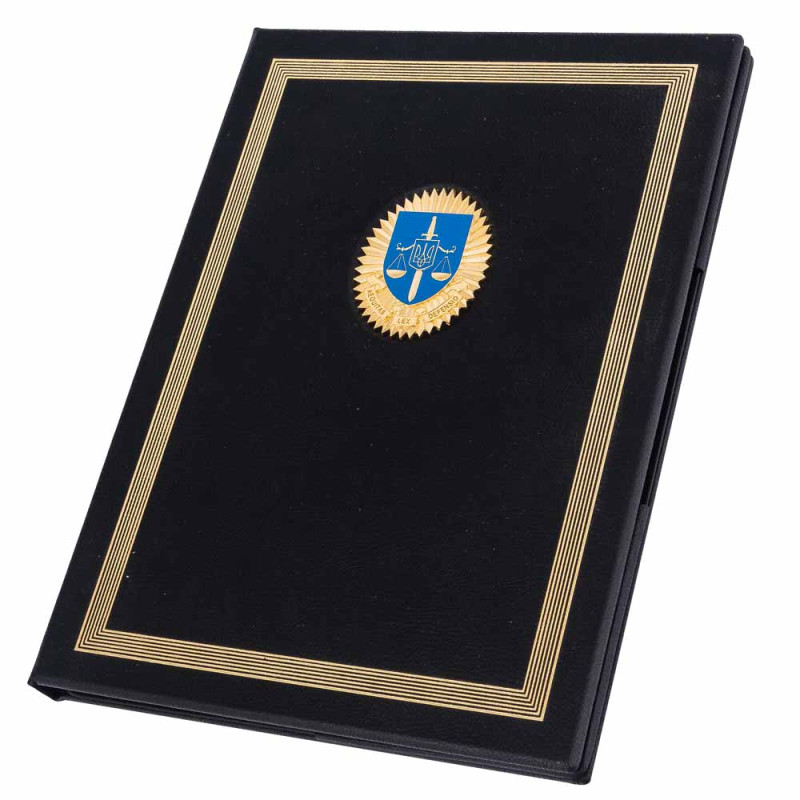 Изготовленная из натуральной черной кожи, папка имеет сдержанный, солидный вид, а золотистое тиснение по периметру придает элегантность и благородный блеск. Центральным элементом дизайна является массивная металлическая эмблема с позолотой – символ Генеральной прокуратуры Украины. В центре – синий щит с мечом (защита закона), весами (правосудие) и трезубцем – малым Государственным Гербом Украины. Контрастные эмали и лучевая окантовка эмблемы усиливают визуальную глубину и торжественность.