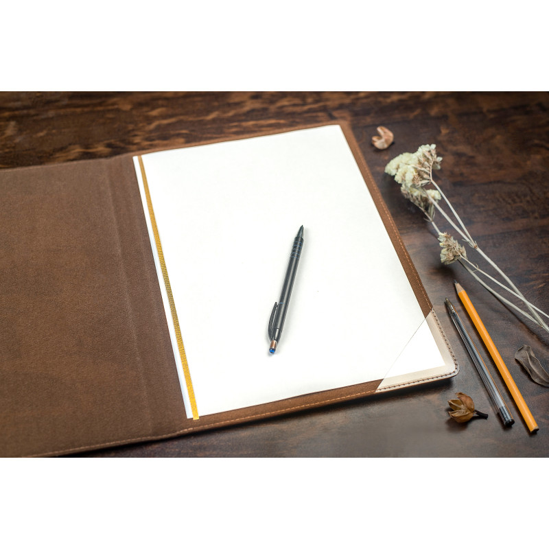 Папка ручной работы изготовлена из итальянской натуральной кожи высочайшего качества. В папке предусмотрена резинка - держатель. Декор выполнен по технологии конгревного тиснения с нанесением позолоты, тонировки и лакового покрытия.
