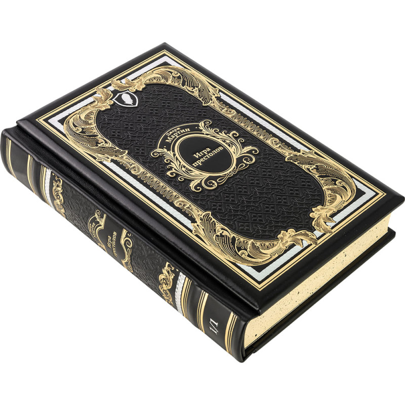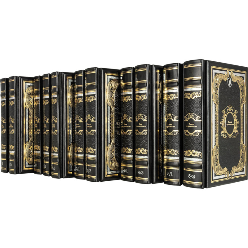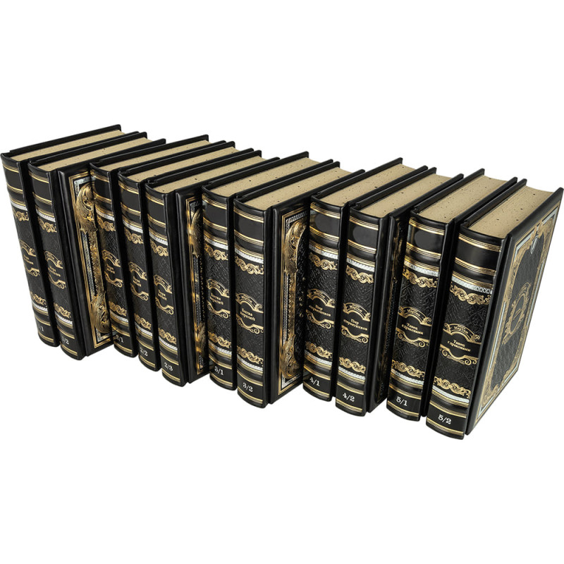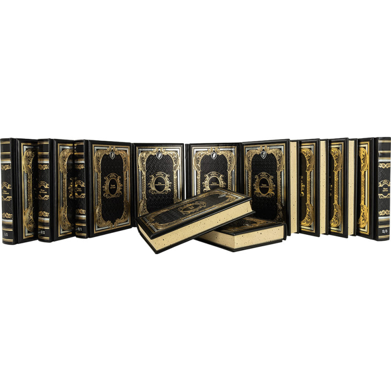 Составной переплет «Брадель» ручной работы, выполнен из натуральной кожи «Robbat Nero» производства итальянской кожевенной фабрики Carisma». Обложка книг оформлена комбинацией многоуровневого объемного тиснения: рельефного золотого и серебряного, c использованием фольги «Luxor 240» и глубокого блинтового.