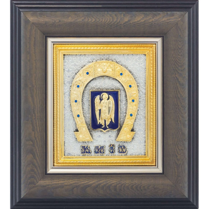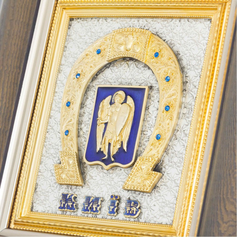 Основу композиции подарка составляют: подкова - символ счастья и благополучия; и герб города Киева, утвержденный решением Киевского городского совета № 57 от 18 апреля 1995 года. "Архангел Михаил символизирует светлые силы, готовые защищать Киев от бед. Фигура Архангела Михаила в белой княжеской рубашке, воинском облачении с серебряным доспехами, декорированном стилизованным диском Солнца, изображен на голубом фоне древнерусского (варяжского) щита. В правой руке Архангела Михаила - повернутый в сторону огненный меч, символ защиты, в левой - серебряный щит в золотом обрамление с изображением золотого креста, символа Света и Христианской веры. Золотой нимб - символ святости."