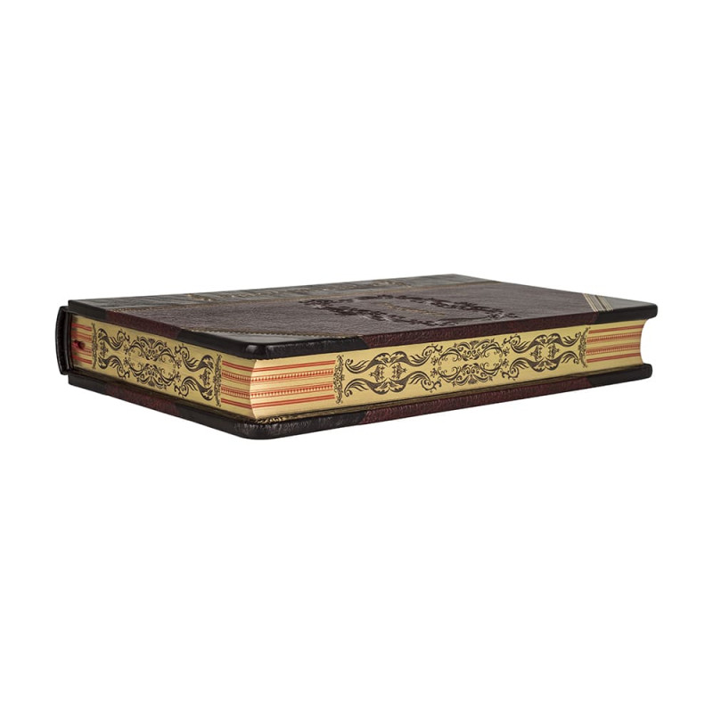 Составной переплет "Брадель", ручной работы, изготовлен из комбинации натуральных кож (кожа "Plonge Brown" и "Marma Rossa" производства итальянской кожевенной фабрики "Claudio". Обложка книги оформлена многоуровневым тиснением: рельефным золотым и глубоким блинтовым, с использованием золотой фольги в 24 карата. Обрез книги выполнен в авторской технике позолоты с нанесением орнамента.
