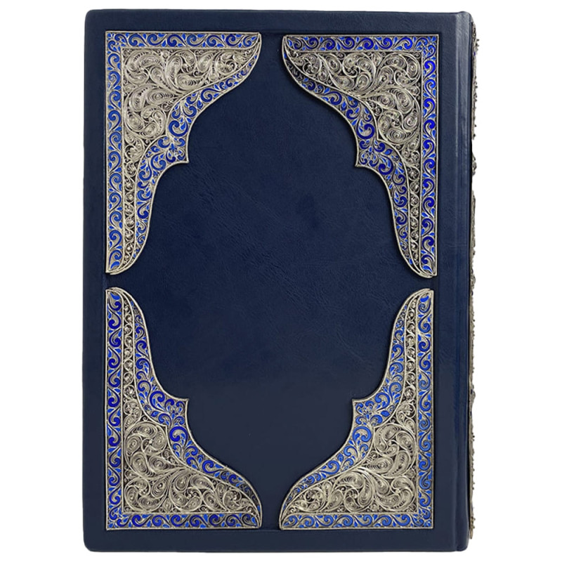 Торцевая сторона книги украшена красивой медной накладкой, которая покрыта серебром. По всему периметру книги нанесена роспись художественными ювелирными эмалями. Эмали выполнены в различных цветах и оттенках, что придает книге неповторимый и изысканный вид.