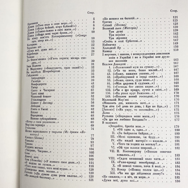 Книга включает в себя 8 поэм и 48 стихотворений, которые охватывают широкий спектр тем, включая любовь, свободу, борьбу за независимость, красоту украинской природы и культуры. Тарас Шевченко использует простой, но выразительный язык, который легко доступен для понимания. Его стихи наполнены глубоким чувством патриотизма и любви к своему народу.