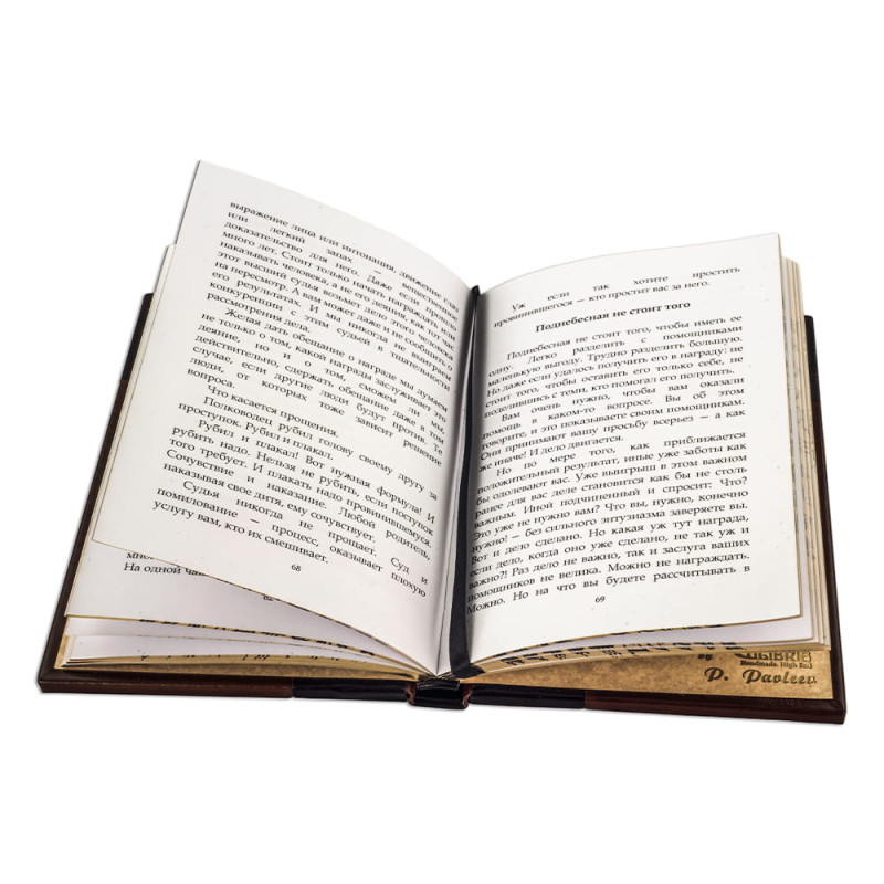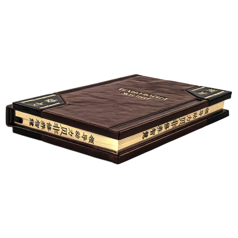 Составной переплет "Брадель", ручной работы, выполнен из комбинации натуральных кож (кожа теленка "Robbat Wisky", кожа "Robbat Cognac" производства итальянской кожевенной фабрики "Carisma"). Обложка книги оформлена комбинацией многоуровневого объемного тиснения: рельефного золотого, c использованием фольги "Luxor 240" и глубокого блинтового. Обрез книги выполнен в уникальной технологии художественной запечатки золотой основы.