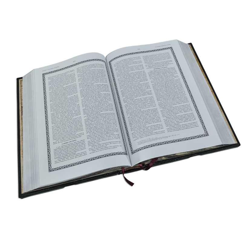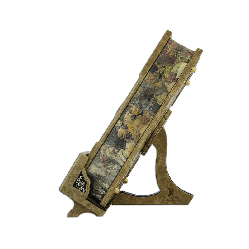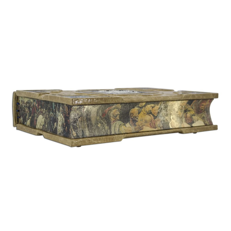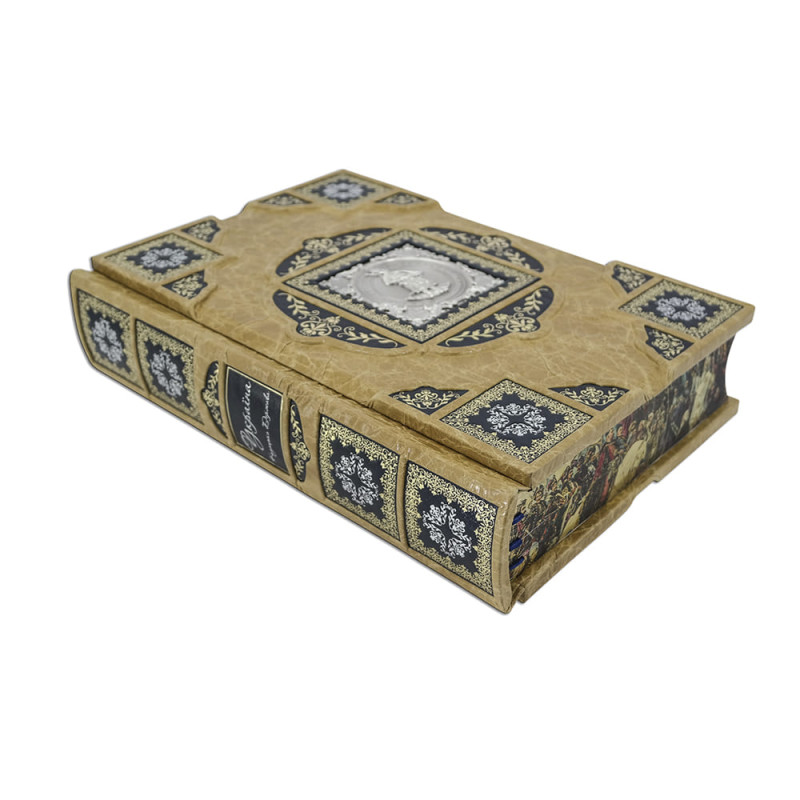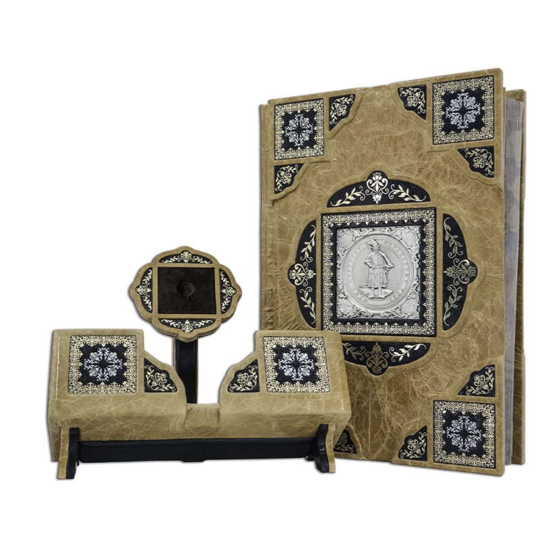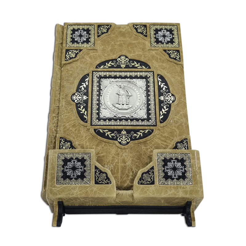 Составной переплет "Брадель", ручной работы, изготовлен из комбинации натуральной кожи (кожа "Vega Beige", кожа "Robbat Nero" производства итальянской фабрики "Carisma"). Обложка книги украшена комбинацией рельефного тиснения, с использованием золотой и серебряной фольги "Luxor 240", композицией с гальванопластики "Казак" с серебрением. Подставка изготовлена вручную из той же комбинации кож, что и книга, является органичным дополнением книги, максимально усиливает впечатление от подарочного комплекта. Обрез выполнен в уникальной технологии художественной запечатки золотой основы.