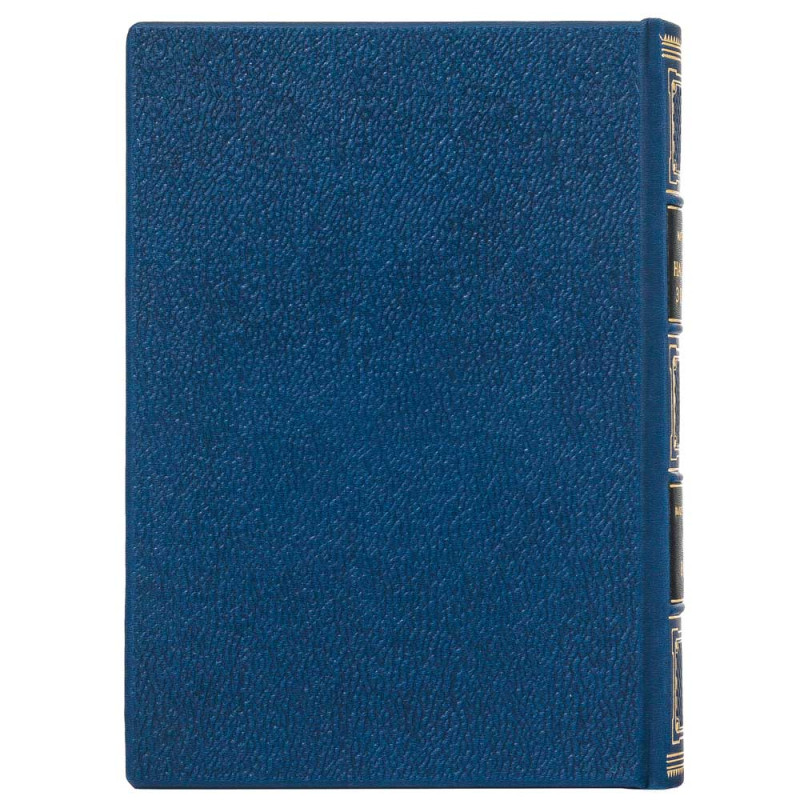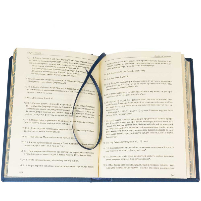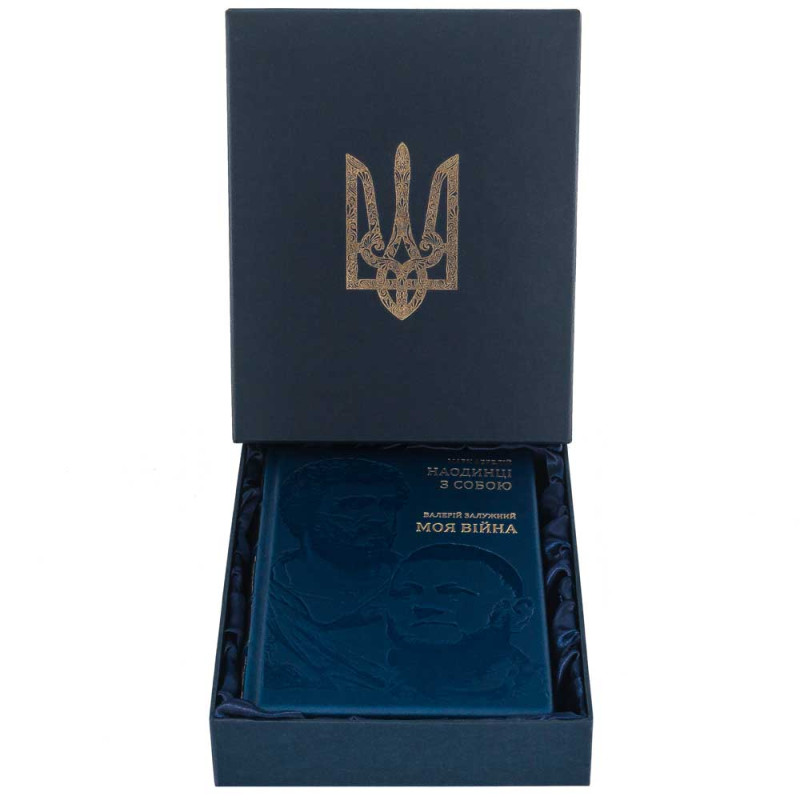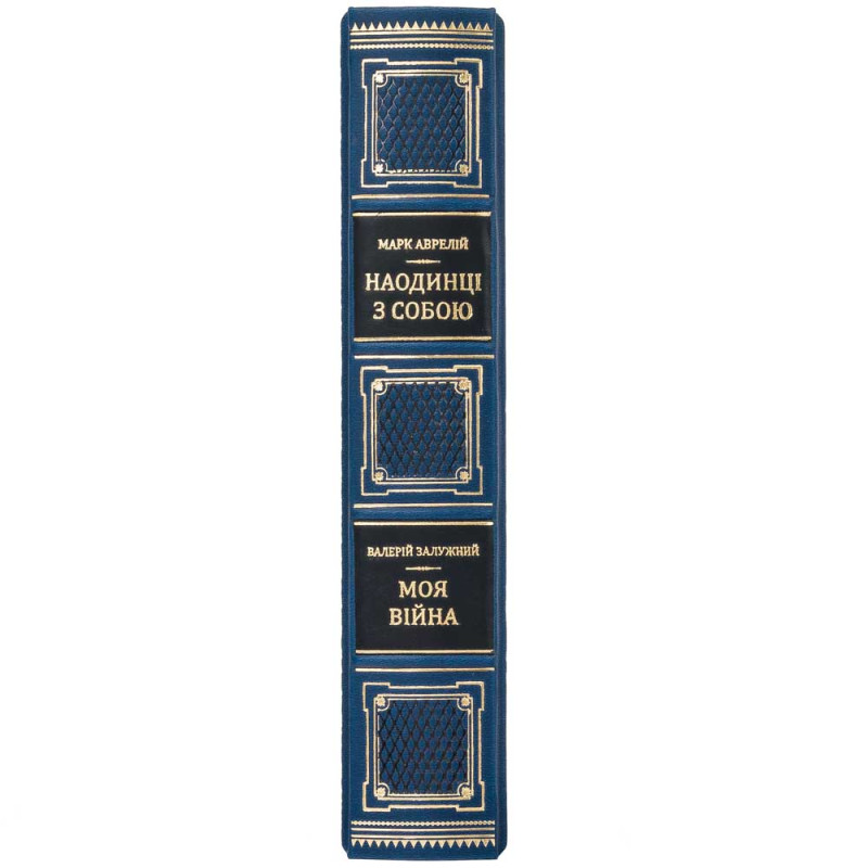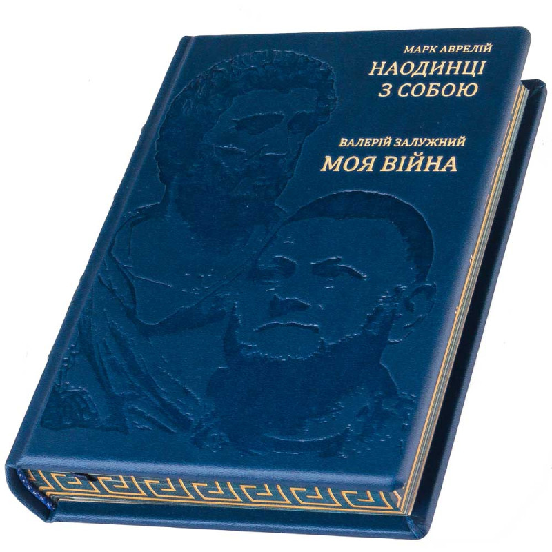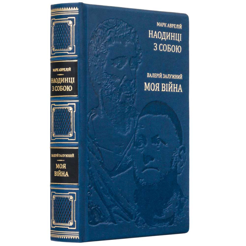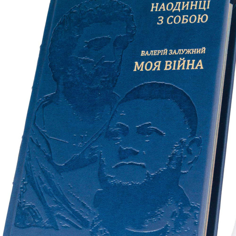 Книга облачена в переплёт из натуральной кожи насыщенного синего цвета, что подчёркивает её статус и долговечность. На обложке выполнено глубокое конгревное тиснение с портретами Марка Аврелия и Валерия Залужного — символическое соединение стоической мудрости античности и опыта современного военного руководителя.