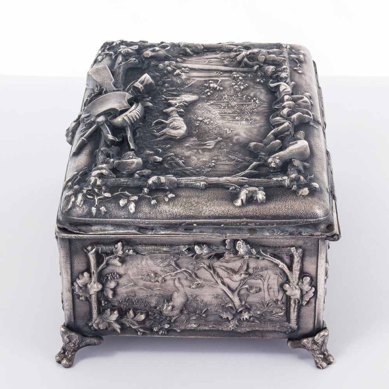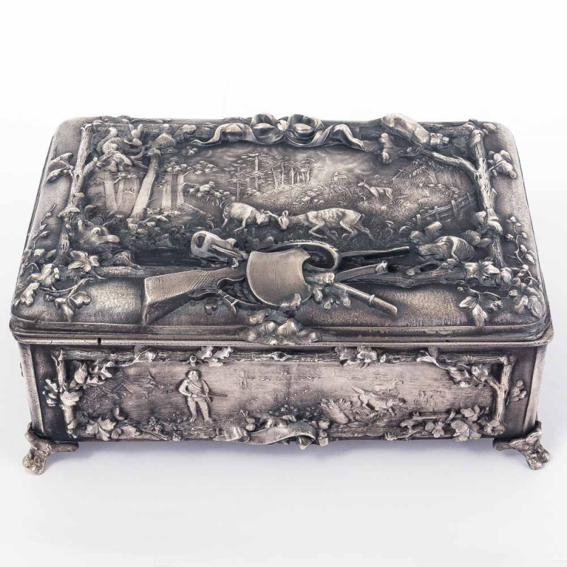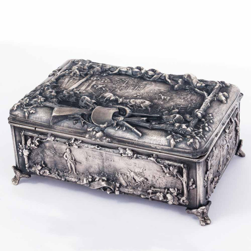 Шкатулка выполнена из бронзы и покрыта слоем серебра. Поверхность украшена богатым рельефным декором со сценами охоты: олени, кабаны, охотники с ружьями и собаками, окружённые растительными орнаментами.