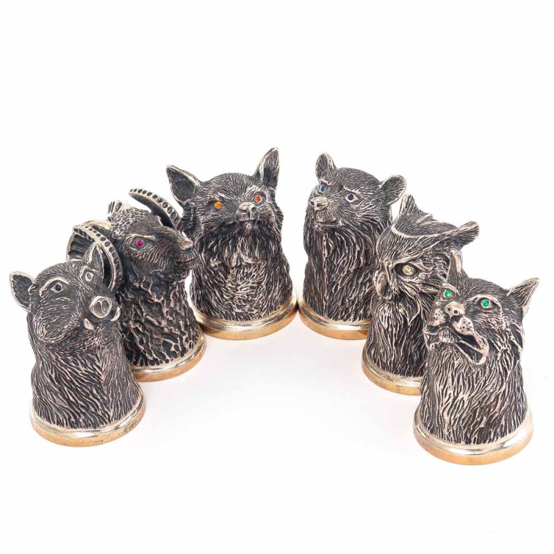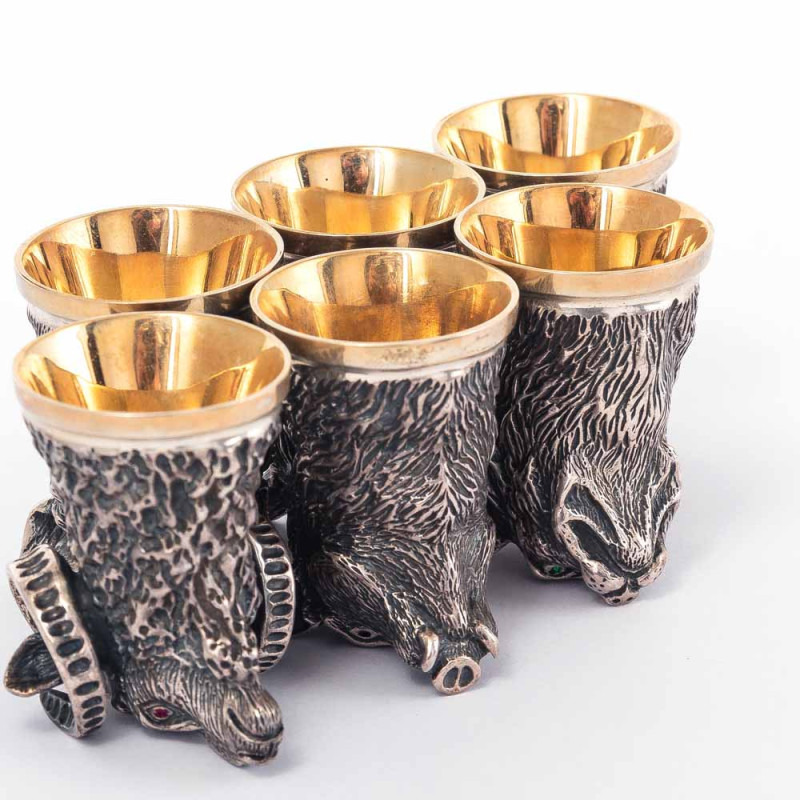 В набор входят 6 ритонов общей массой 883,2 г. Они изготовлены из чистого серебра 925 пробы. Внутренняя поверхность позолочена, что придаёт блеск и защищает металл. Основания выполнены в виде скульптурных голов барана, вепря и совы (по два ритона каждого вида).