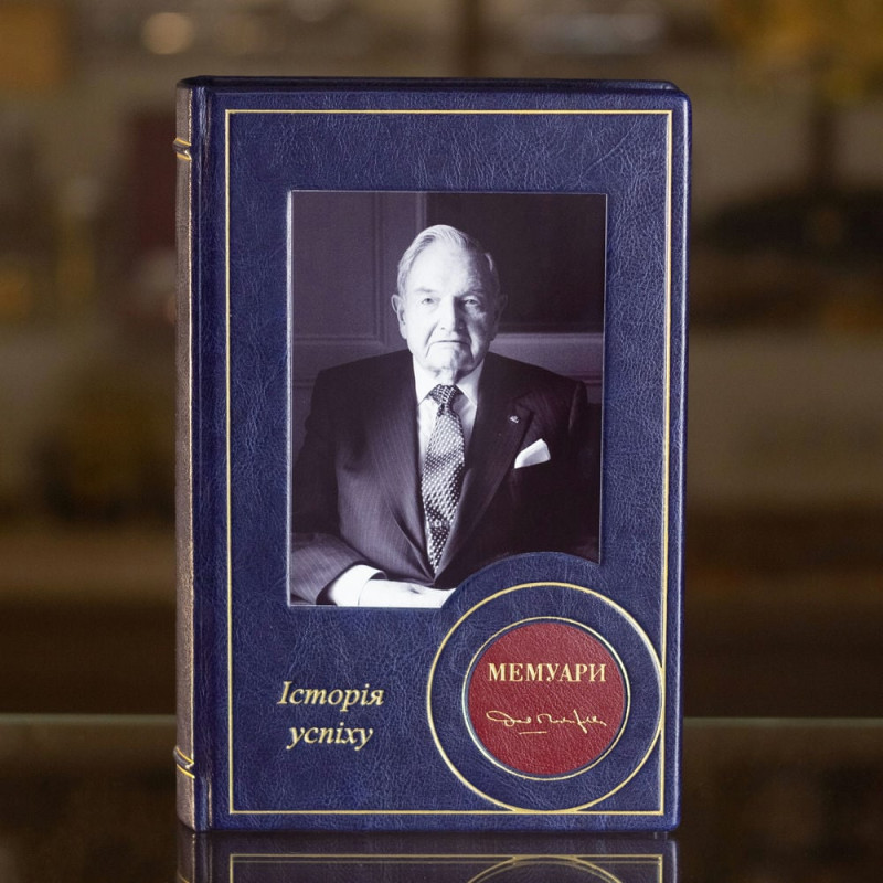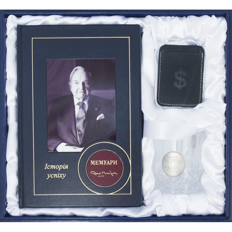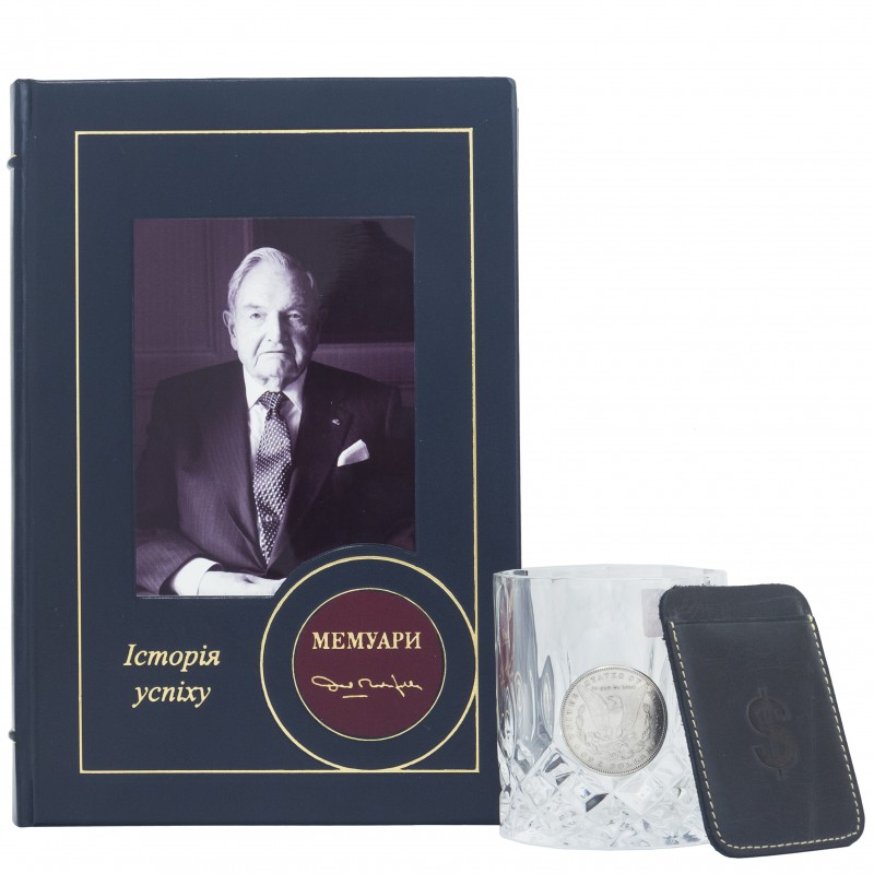 Данный подарочный набор состоит из книги "Мемуары" Дэвид Рокфеллер, оформленой в переплёт из натуральной высококачественной кожи ручной работы, хрустального стакана для виски Old fashioned с накладкой из меди, которая покрыта серебром и кошелька из натуральной кожи для кредитных карт.