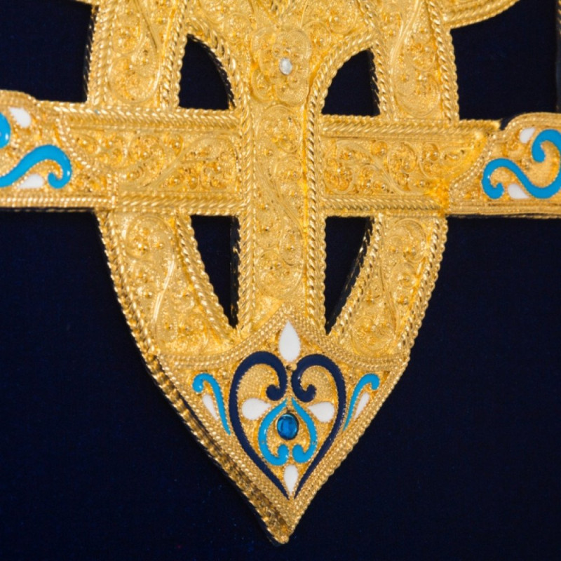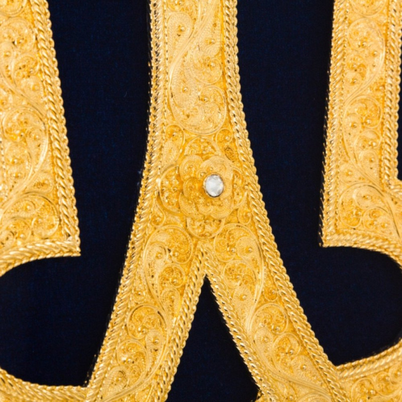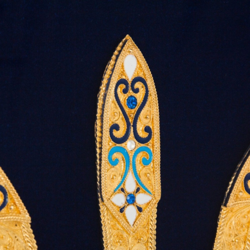 Панно изготовлено из высококачественной меди, покрытой благородной позолотой. Элементы декорированы эмалью, что придает изделию изысканность и глубину цвета. Глубокий синий цвет бархатной основы идеально оттеняет золотистый трезуб, создавая роскошный контраст.