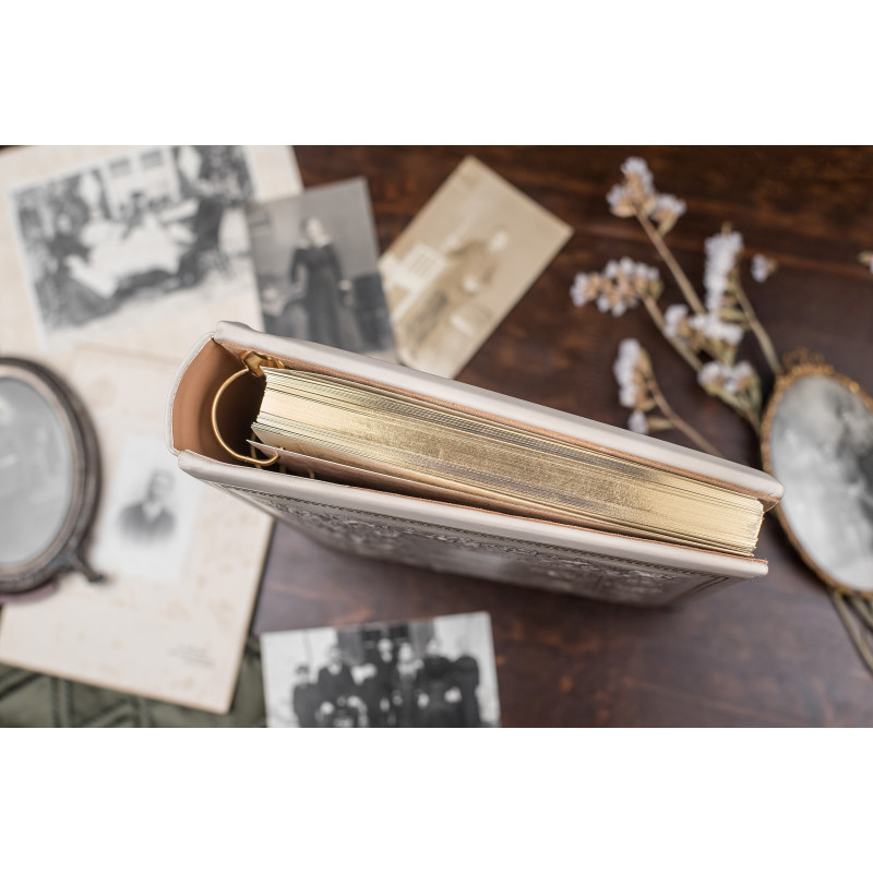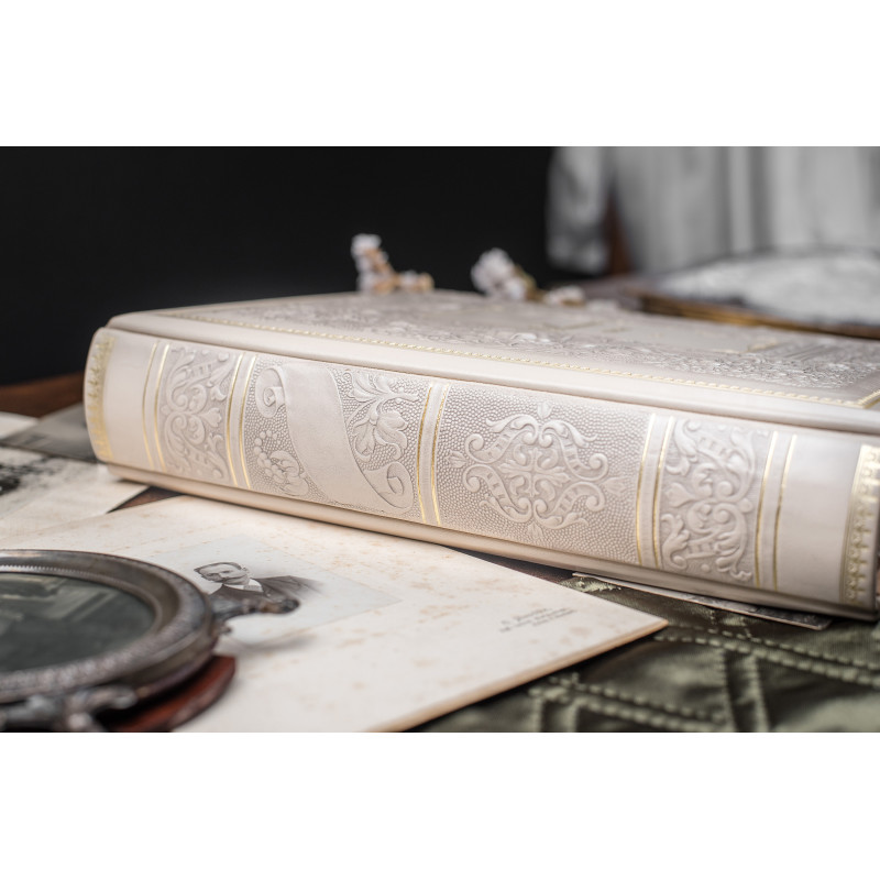 Данная подарочная книга оформлена в кожаный переплет ручной работы. Декор по книге выполнен по технологии конгревного тиснения с нанесением позолоты, тонировки и лакового покрытия. Книга имеет золотой срез торцов блока.