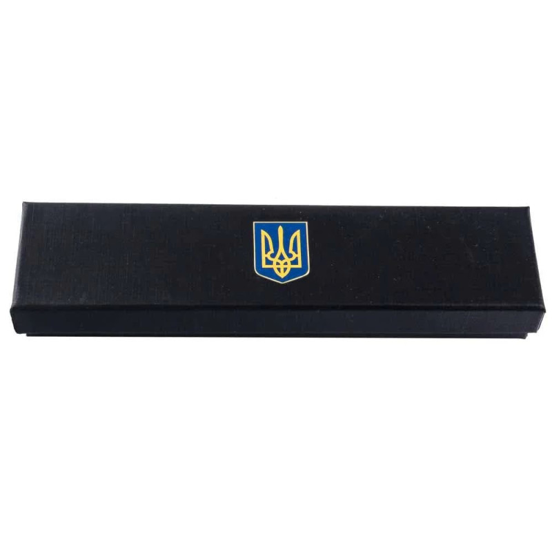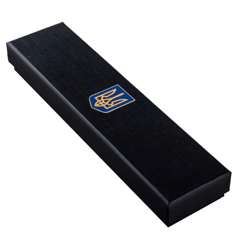 Подарок упакован в брендированный футляр, украшенный металлическими накладками с украинским трезубцем, выполненными по методу сублимационной двухцветной печати. Благодаря этому дизайн приобретает глубину, а каждая деталь выглядит выразительно и достойно.