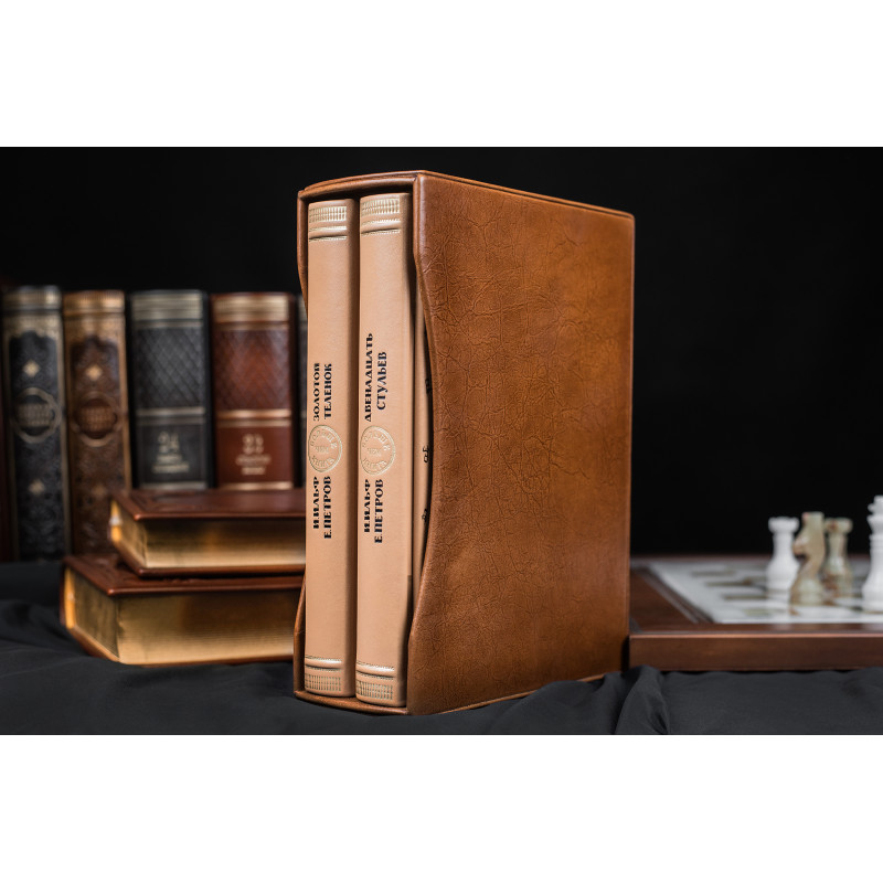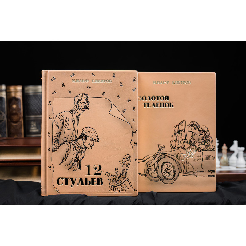 Прекрасными романами-фельетонами И.Ильфа и Е.Петрова - "Двенадцать стульев" и "Золотой телёнок" мы восторгаемся еще со школы. У вас появилась уникальная возможность купить набор из двух книг "Двенадцать стульев" и "Золотой телёнок" в кожаных переплётах ручной работы. Если вы думаете взять такой набор на подарок, то будьте уверены, что этот презент понравится человеку, ведь обе книги входят в золотой фонд литературы ХХ века. Большинство украинских, российских и западных литераторов признают их лучшими книгами начала ХХ века.