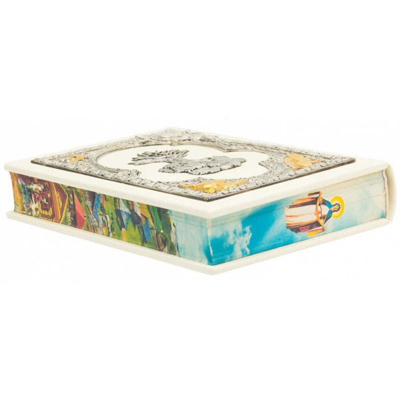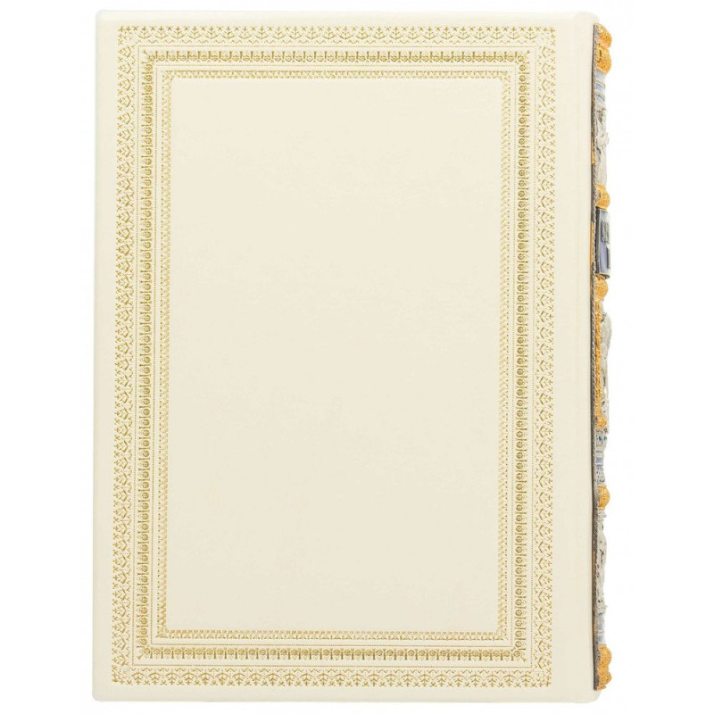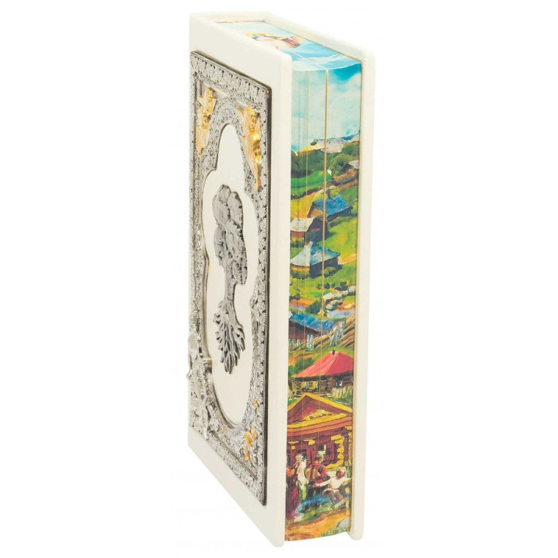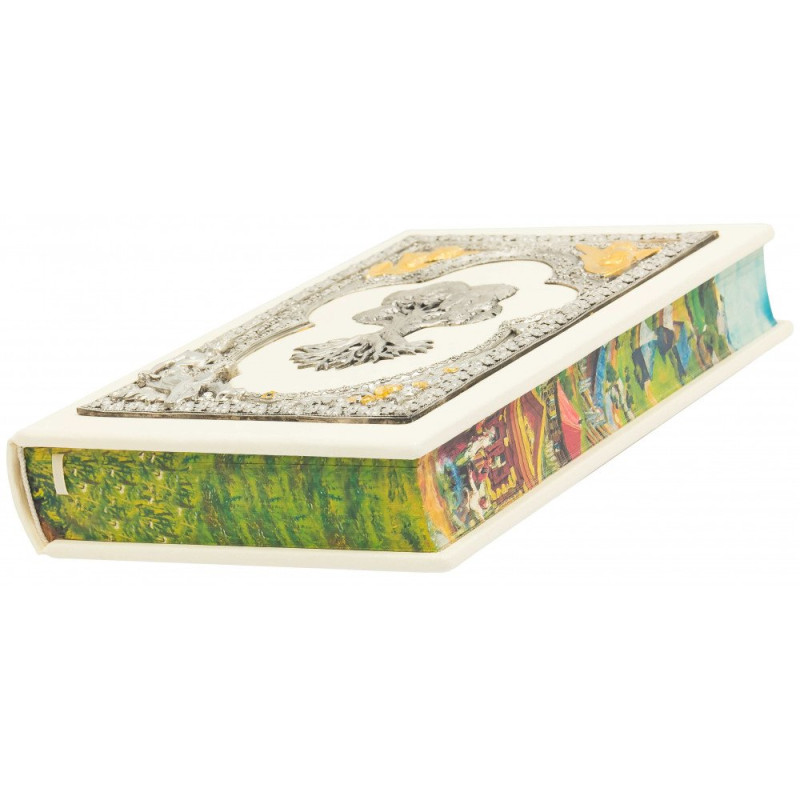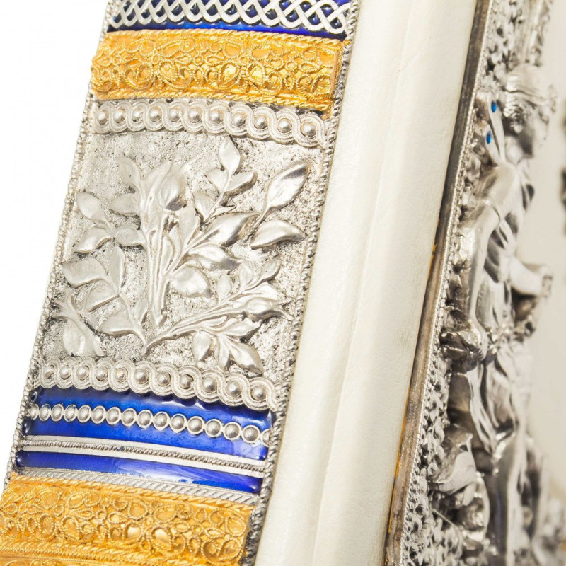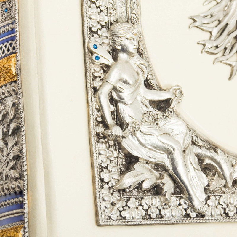 Данная подарочная книга оформлена в переплет из натуральной высококачественной кожи ручной работы. Книга украшена золотым тиснением. На книге есть посеребренные и позолоченные накладки, украшения художественной ювелирной эмалью и стразы. С боковой части книги есть цветной срез.